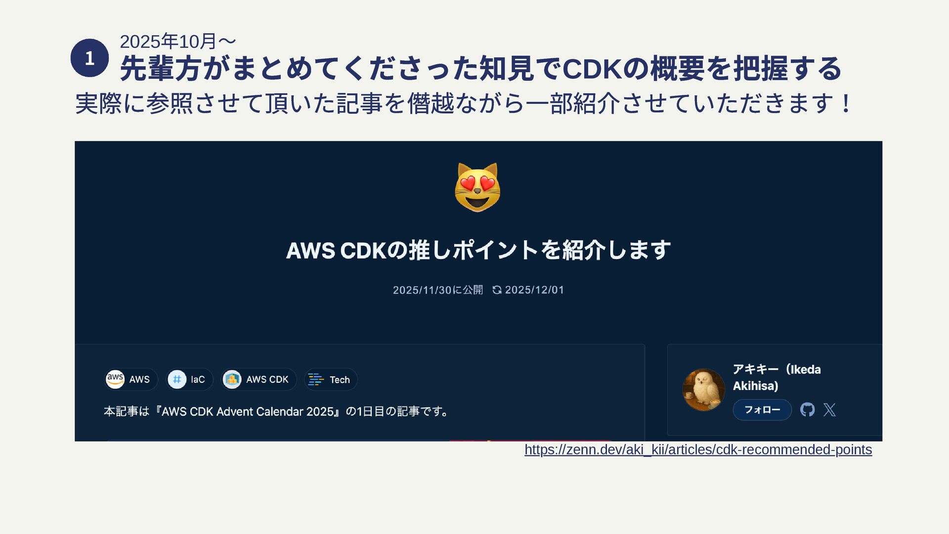 1 https://zenn.dev/aki_kii/articles/cdk-recommended-points 2025 年10 月〜 先輩方がまとめてくださった知見でCDK の概要を把握する 実際に参照させて頂いた記事を僭越ながら一部紹介させていただきます!