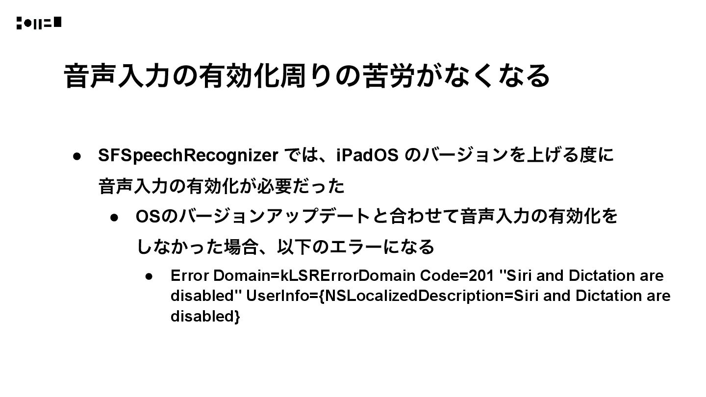 Իೖྗͷ༗ޮԽपΓͷۤ࿑͕ͳ͘ͳΔ • SFSpeechRecognizer ͰɺiPadOS ͷόʔδϣϯΛ্͛Δʹ Իೖྗͷ༗ޮԽ͕ඞཁͩͬͨ • OSͷόʔδϣϯΞοϓσʔτͱ߹ΘͤͯԻೖྗͷ༗ޮԽΛ ͠ͳ͔ͬͨ߹ɺҎԼͷΤϥʔʹͳΔ •