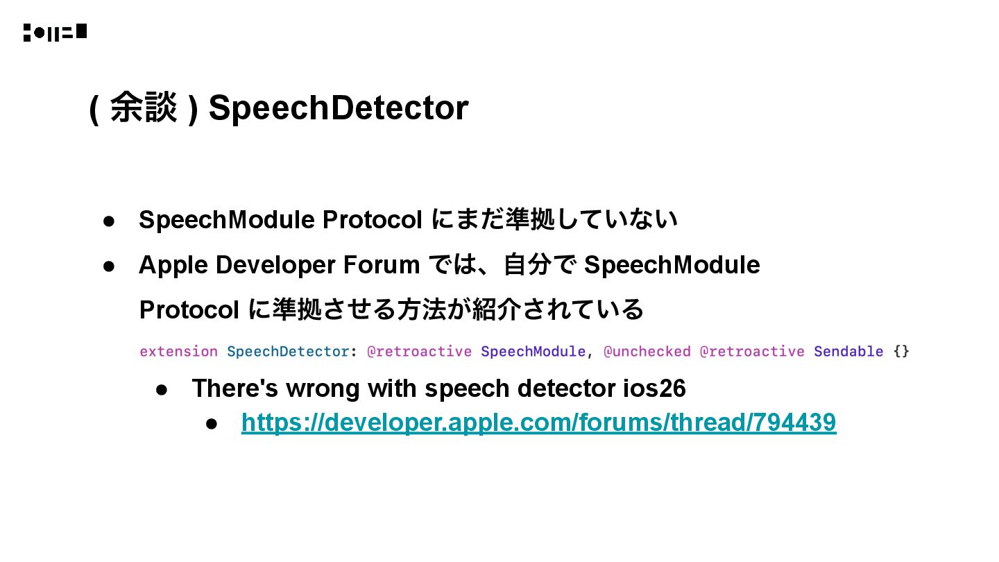 Developer Forum ͰɺࣗͰ SpeechModule Protocol ʹ४ڌͤ͞Δํ๏͕հ͞Ε͍ͯΔ • There's wrong with speech detector ios26 • https://developer.apple.com/forums/thread/794439
