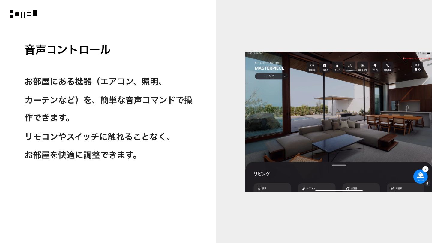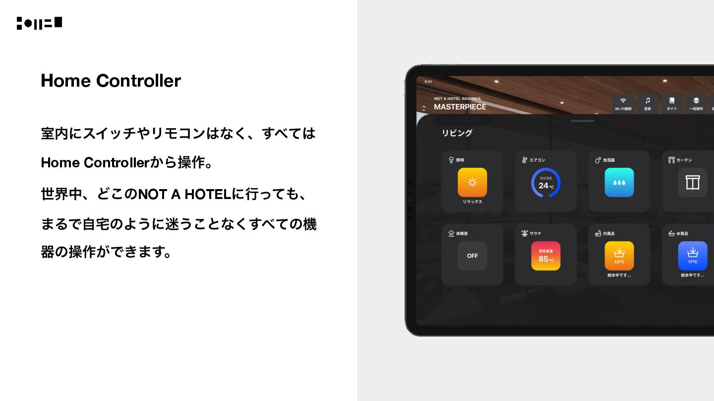 ࣨʹεΠονϦϞίϯͳ͘ɺͯ͢ Home Controller͔Βૢ࡞ɻ ੈքதɺͲ͜ͷNOT A HOTELʹߦͬͯɺ ·ΔͰࣗͷΑ͏ʹ໎͏͜ͱͳͯ͘͢ͷػ ثͷૢ࡞͕Ͱ͖·͢ɻ Home Controller