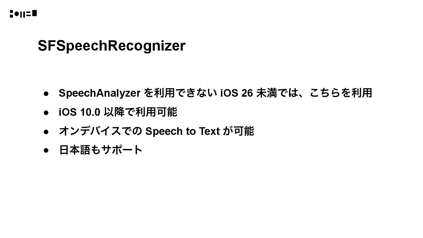 SFSpeechRecognizer • SpeechAnalyzer Λར༻Ͱ͖ͳ͍ iOS 26 ະຬͰɺͪ͜ΒΛར༻ • iOS 10.0