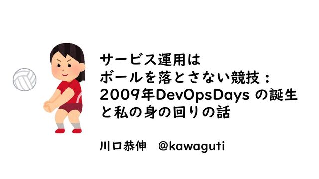 DevOpsDays を 東京でやることになり、 国内外から実践者の スピーカーを集めて 話をしてもらうことに。 高くない会場を借りて、 チケット設定して、 スポンサーをお願いしただけ ですけど、場の基盤が