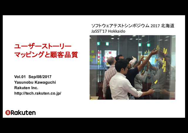 ユーザーストーリー マッピングと顧客品質 Vol.01 Sep/08/2017 Yasunobu Kawaguchi Rakuten Inc. http://tech.rakuten.co.jp/ ソフトウェアテストシンポジウム