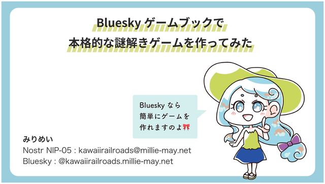 ΈΓΊ͍ /PTUS/*1LBXBJJSBJMSPBET!NJMMJFNBZOFU #MVFTLZ!LBXBJJSBJMSPBETNJMMJFNBZOFU Bluesky ゲームブックで 本格的な謎解きゲームを作ってみた #MVFTLZ ͳΒ ؆୯ʹήʔϜΛ ࡞Ε·͢ͷΑ