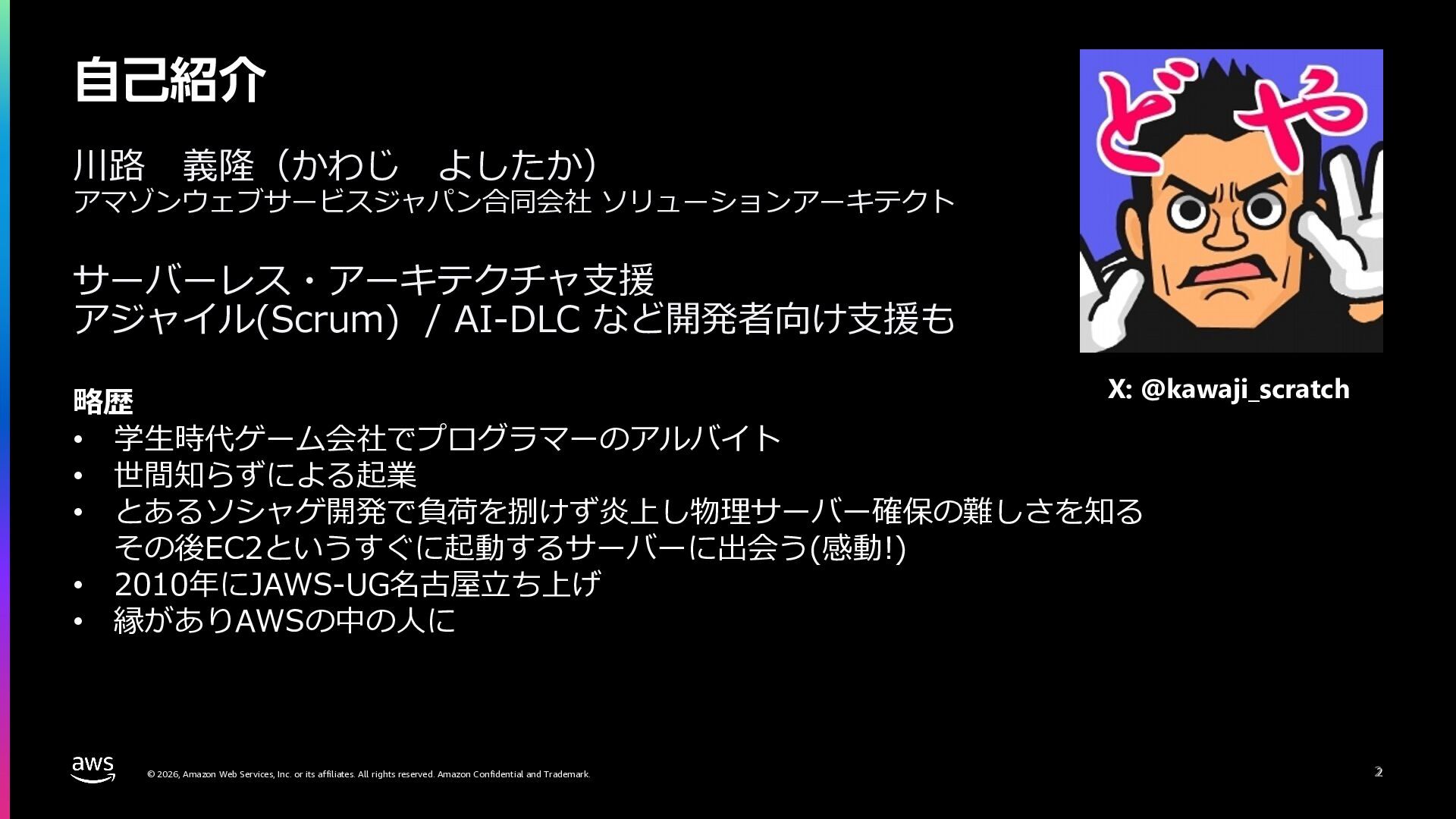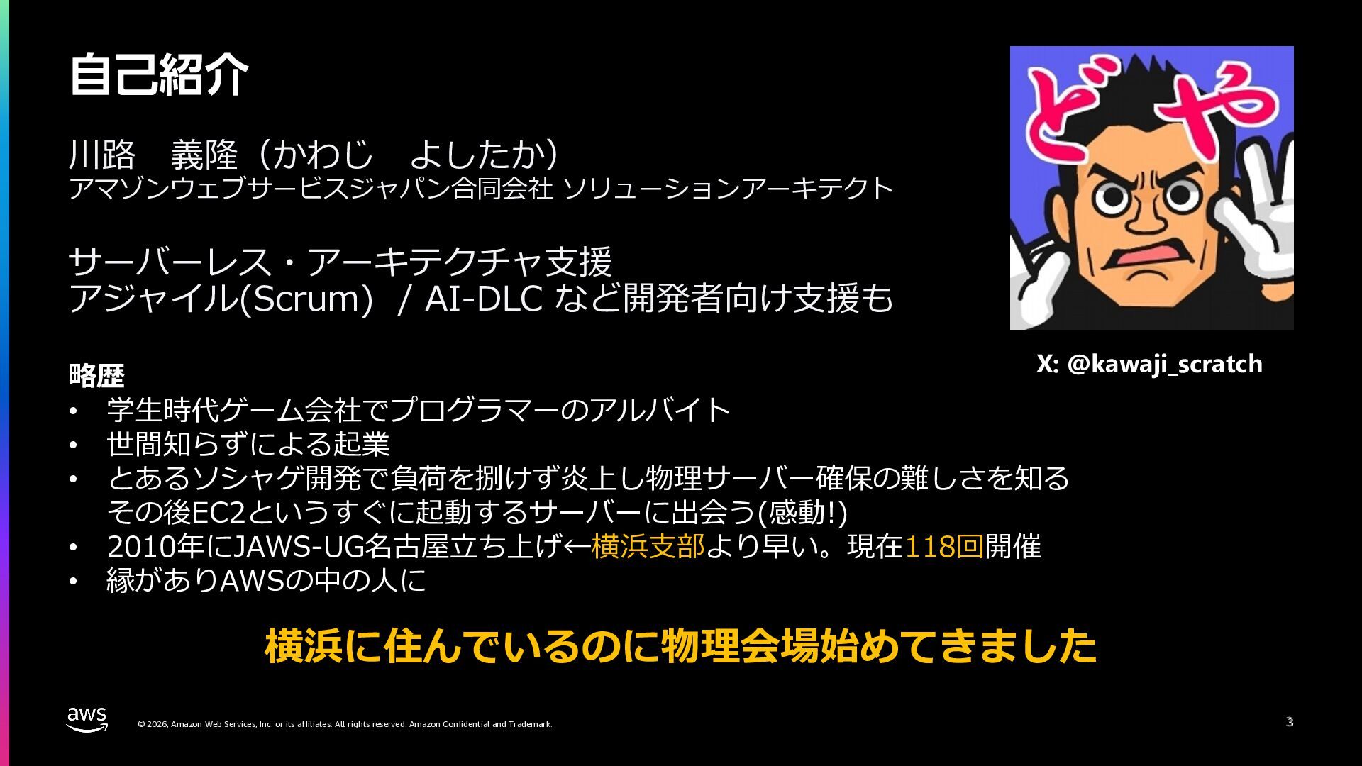 rights reserved. Amazon Confidential and Trademark. 2 川路 義隆(かわじ よしたか) アマゾンウェブサービスジャパン合同会社 ソリューションアーキテクト サーバーレス・アーキテクチャ⽀援 アジャイル(Scrum) / AI-DLC など開発者向け⽀援も ࣗݾ঺հ 2 略歴 • 学⽣時代ゲーム会社でプログラマーのアルバイト • 世間知らずによる起業 • とあるソシャゲ開発で負荷を捌けず炎上し物理サーバー確保の難しさを知る その後EC2というすぐに起動するサーバーに出会う(感動!) • 2010年にJAWS-UG名古屋⽴ち上げ • 縁がありAWSの中の⼈に X: @kawaji_scratch