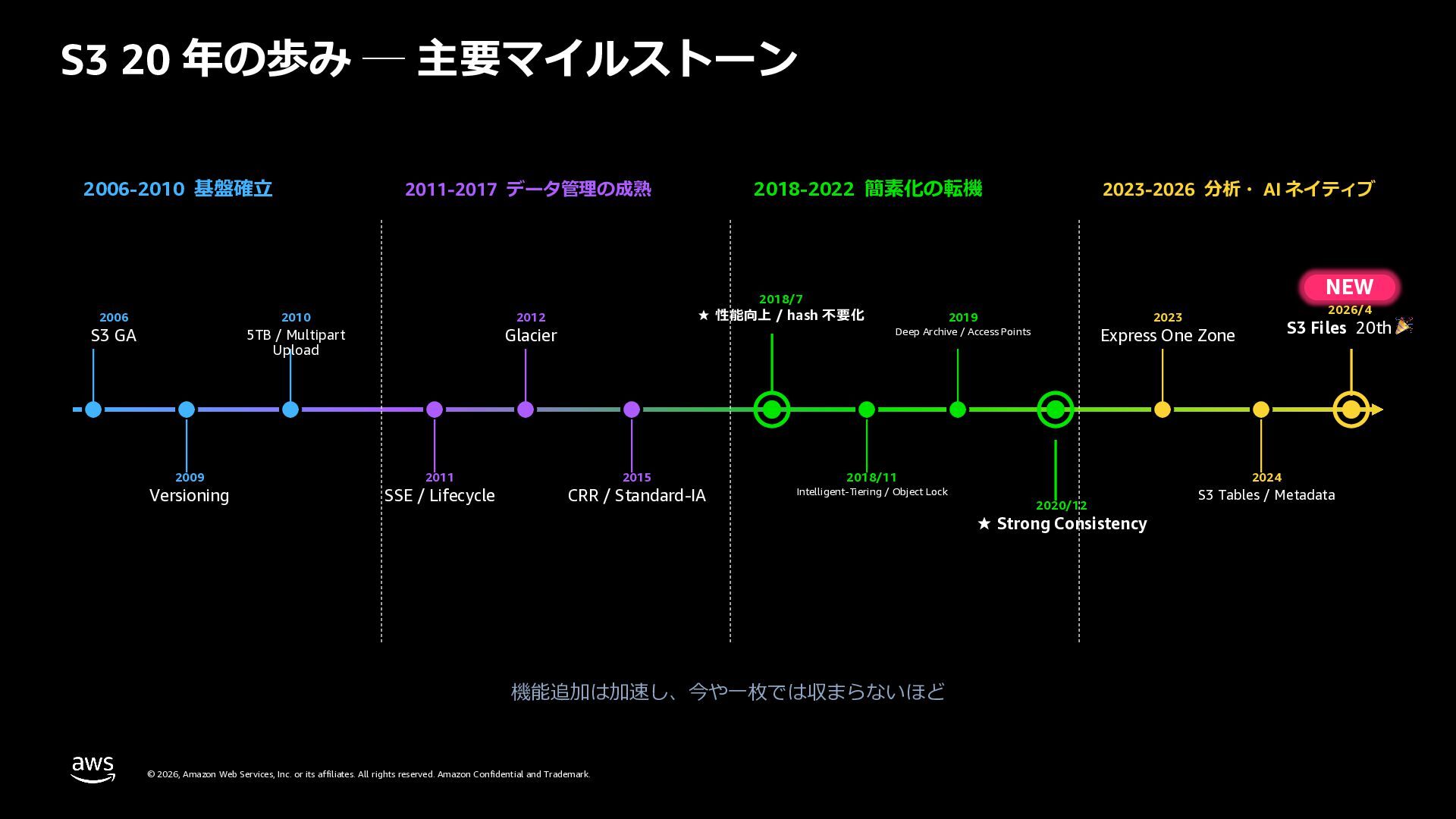 rights reserved. Amazon Confidential and Trademark. S3 20 年の歩み ─ 主要マイルストーン 2006-2010 基盤確⽴ 2011-2017 データ管理の成熟 2018-2022 簡素化の転機 2023-2026 分析・ AI ネイティブ 2006 S3 GA 2009 Versioning 2010 5TB / Multipart Upload 2011 SSE / Lifecycle 2012 Glacier 2015 CRR / Standard-IA 2018/7 ★ 性能向上 / hash 不要化 2018/11 Intelligent-Tiering / Object Lock 2019 Deep Archive / Access Points 2020/12 ★ Strong Consistency 2023 Express One Zone 2024 S3 Tables / Metadata NEW 2026/4 S3 Files 20th 🎉 機能追加は加速し、今や⼀枚では収まらないほど