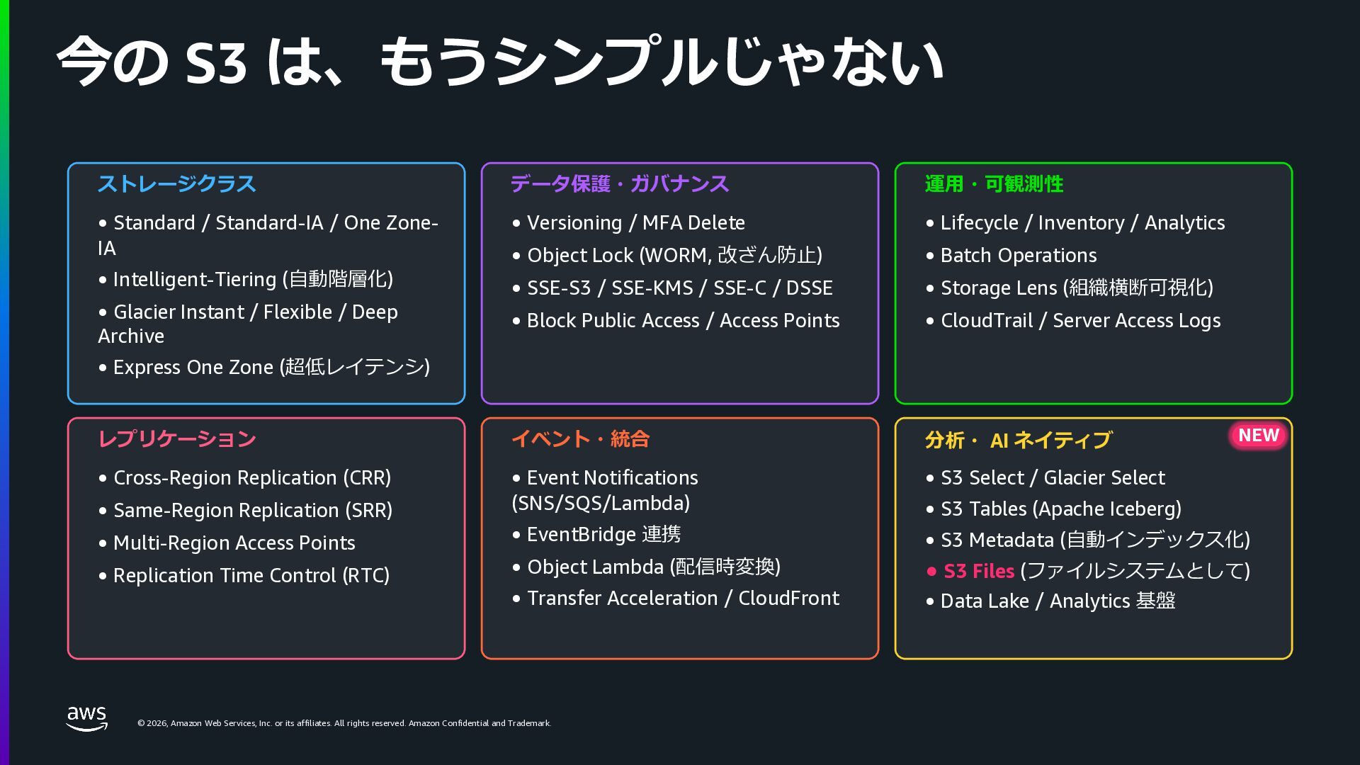 rights reserved. Amazon Confidential and Trademark. © 2026, Amazon Web Services, Inc. or its affiliates. All rights reserved. Amazon Confidential and Trademark. 今の S3 は、もうシンプルじゃない ストレージクラス • Standard / Standard-IA / One Zone- IA • Intelligent-Tiering (⾃動階層化) • Glacier Instant / Flexible / Deep Archive • Express One Zone (超低レイテンシ) データ保護・ガバナンス • Versioning / MFA Delete • Object Lock (WORM, 改ざん防⽌) • SSE-S3 / SSE-KMS / SSE-C / DSSE • Block Public Access / Access Points 運⽤・可観測性 • Lifecycle / Inventory / Analytics • Batch Operations • Storage Lens (組織横断可視化) • CloudTrail / Server Access Logs レプリケーション • Cross-Region Replication (CRR) • Same-Region Replication (SRR) • Multi-Region Access Points • Replication Time Control (RTC) イベント・統合 • Event Notifications (SNS/SQS/Lambda) • EventBridge 連携 • Object Lambda (配信時変換) • Transfer Acceleration / CloudFront NEW 分析・ AI ネイティブ • S3 Select / Glacier Select • S3 Tables (Apache Iceberg) • S3 Metadata (⾃動インデックス化) • S3 Files (ファイルシステムとして) • Data Lake / Analytics 基盤