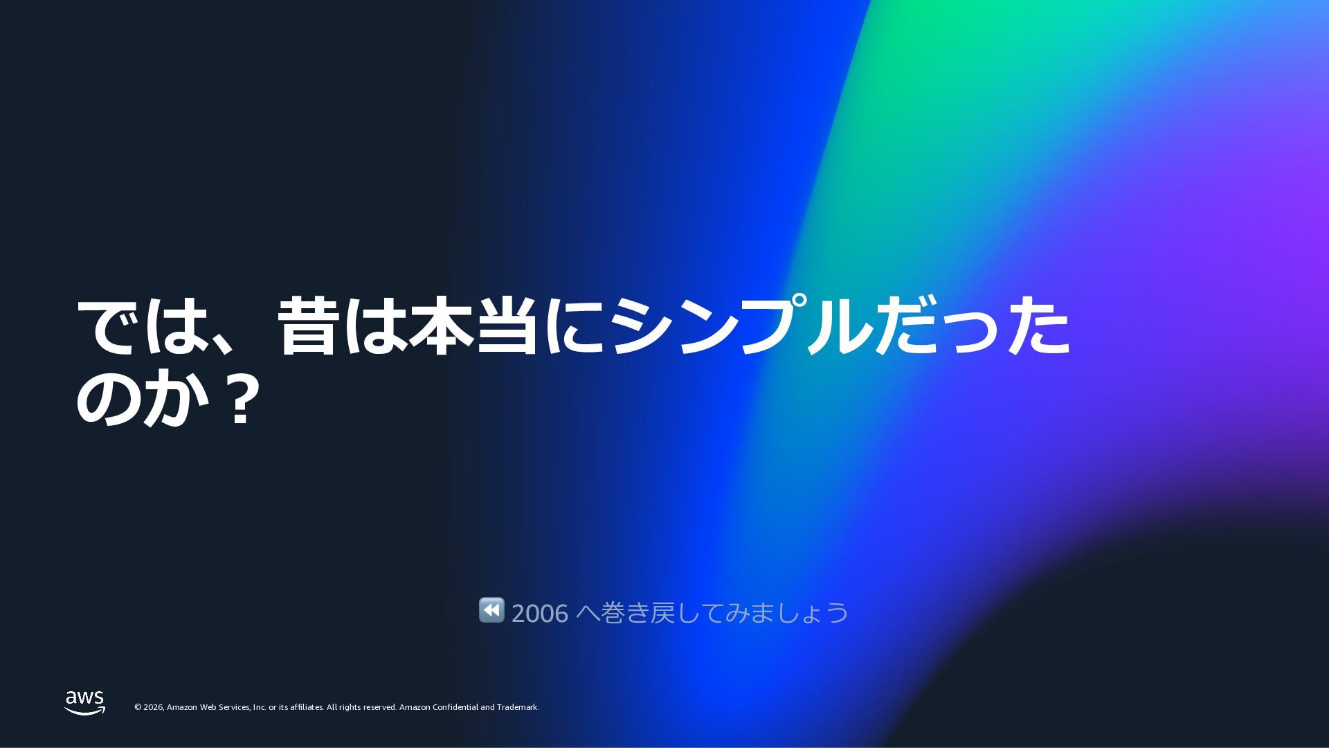 rights reserved. Amazon Confidential and Trademark. © 2026, Amazon Web Services, Inc. or its affiliates. All rights reserved. Amazon Confidential and Trademark. では、昔は本当にシンプルだった のか︖ ⏪ 2006 へ巻き戻してみましょう