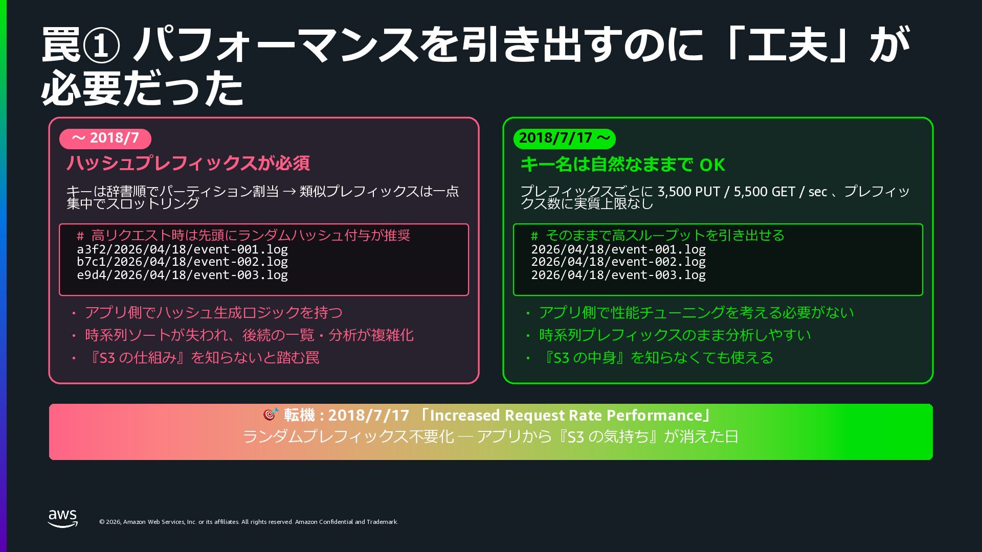 rights reserved. Amazon Confidential and Trademark. © 2026, Amazon Web Services, Inc. or its affiliates. All rights reserved. Amazon Confidential and Trademark. 罠① パフォーマンスを引き出すのに「⼯夫」が 必要だった 〜 2018/7 ハッシュプレフィックスが必須 キーは辞書順でパーティション割当 → 類似プレフィックスは⼀点 集中でスロットリング # ⾼リクエスト時は先頭にランダムハッシュ付与が推奨 a3f2/2026/04/18/event-001.log b7c1/2026/04/18/event-002.log e9d4/2026/04/18/event-003.log ・ アプリ側でハッシュ⽣成ロジックを持つ ・ 時系列ソートが失われ、後続の⼀覧・分析が複雑化 ・ 『S3 の仕組み』を知らないと踏む罠 2018/7/17 〜 キー名は⾃然なままで OK プレフィックスごとに 3,500 PUT / 5,500 GET / sec 、プレフィッ クス数に実質上限なし # そのままで⾼スループットを引き出せる 2026/04/18/event-001.log 2026/04/18/event-002.log 2026/04/18/event-003.log ・ アプリ側で性能チューニングを考える必要がない ・ 時系列プレフィックスのまま分析しやすい ・ 『S3 の中⾝』を知らなくても使える 🎯 転機 : 2018/7/17 「Increased Request Rate Performance」 ランダムプレフィックス不要化 ─ アプリから『S3 の気持ち』が消えた⽇