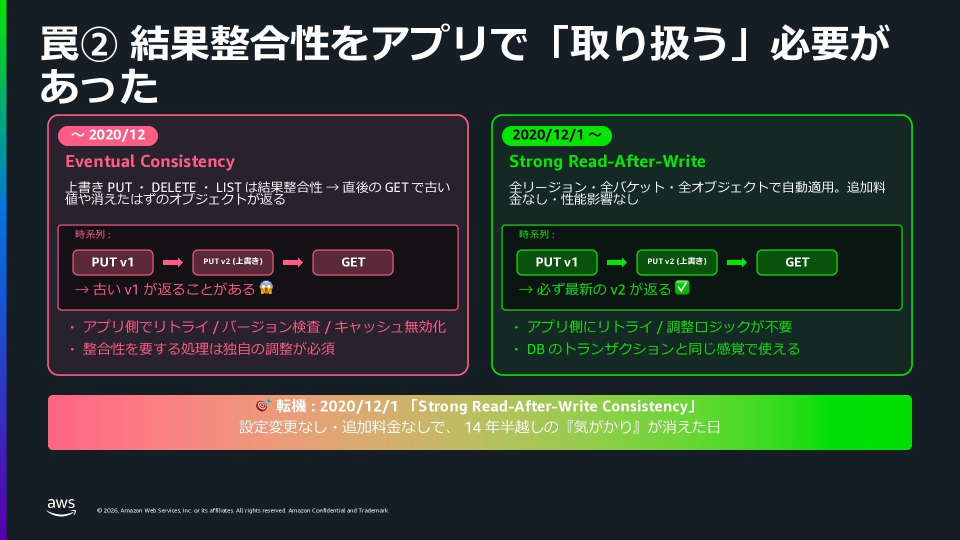 rights reserved. Amazon Confidential and Trademark. © 2026, Amazon Web Services, Inc. or its affiliates. All rights reserved. Amazon Confidential and Trademark. 罠② 結果整合性をアプリで「取り扱う」必要が あった 〜 2020/12 Eventual Consistency 上書き PUT ・ DELETE ・ LIST は結果整合性 → 直後の GET で古い 値や消えたはずのオブジェクトが返る 時系列 : PUT v1 PUT v2 (上書き) GET → 古い v1 が返ることがある 😱 ・ アプリ側でリトライ / バージョン検査 / キャッシュ無効化 ・ 整合性を要する処理は独⾃の調整が必須 2020/12/1 〜 Strong Read-After-Write 全リージョン・全バケット・全オブジェクトで⾃動適⽤。追加料 ⾦なし・性能影響なし 時系列 : PUT v1 PUT v2 (上書き) GET → 必ず最新の v2 が返る ✅ ・ アプリ側にリトライ / 調整ロジックが不要 ・ DB のトランザクションと同じ感覚で使える 🎯 転機 : 2020/12/1 「Strong Read-After-Write Consistency」 設定変更なし・追加料⾦なしで、 14 年半越しの『気がかり』が消えた⽇