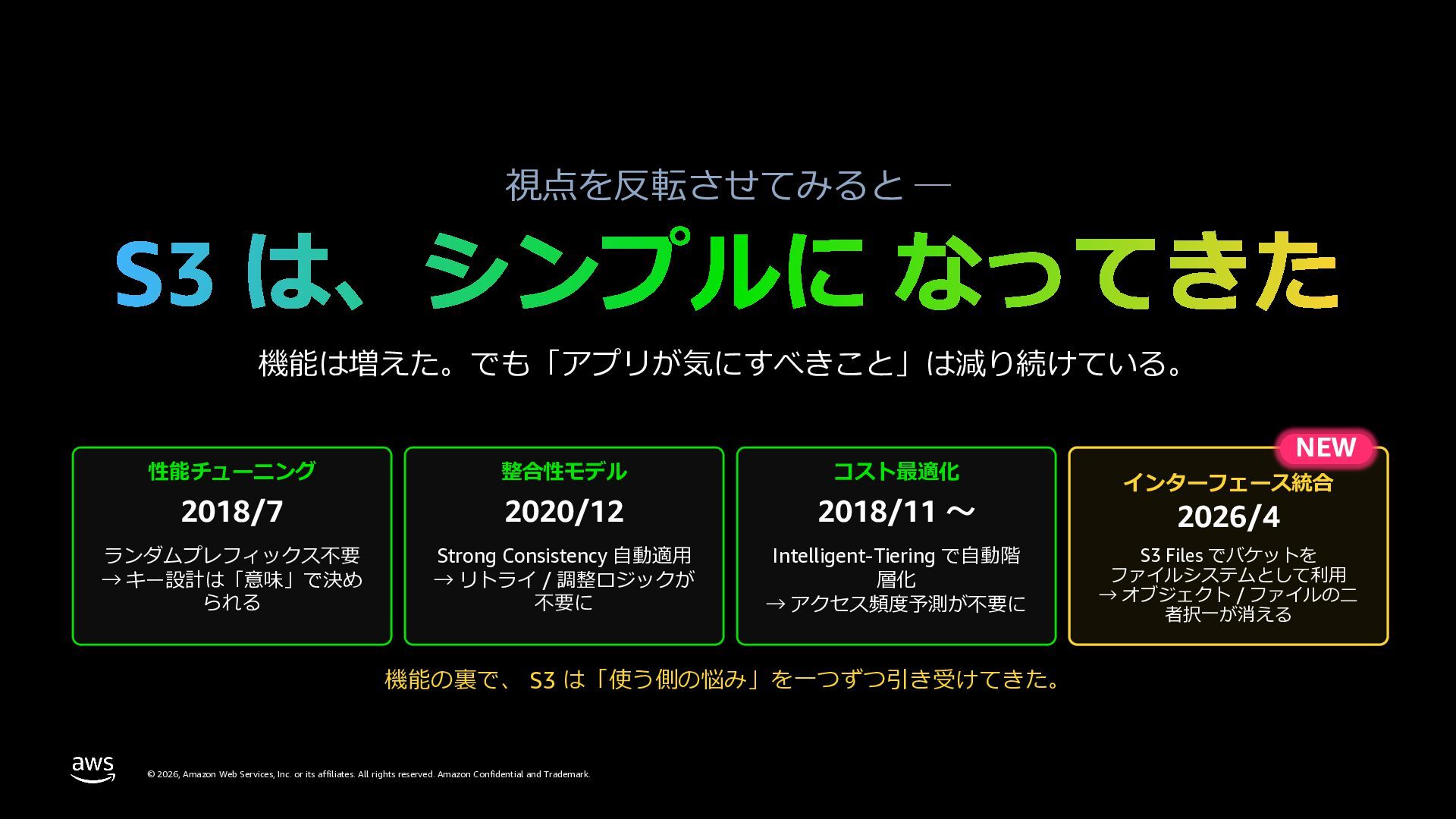 rights reserved. Amazon Confidential and Trademark. 視点を反転させてみると ─ 機能は増えた。でも「アプリが気にすべきこと」は減り続けている。 性能チューニング 2018/7 ランダムプレフィックス不要 → キー設計は「意味」で決め られる 整合性モデル 2020/12 Strong Consistency ⾃動適⽤ → リトライ / 調整ロジックが 不要に コスト最適化 2018/11 〜 Intelligent-Tiering で⾃動階 層化 → アクセス頻度予測が不要に NEW インターフェース統合 2026/4 S3 Files でバケットを ファイルシステムとして利⽤ → オブジェクト / ファイルの⼆ 者択⼀が消える 機能の裏で、 S3 は「使う側の悩み」を⼀つずつ引き受けてきた。