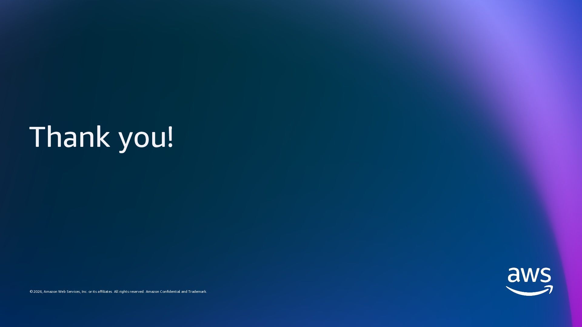 rights reserved. Amazon Confidential and Trademark. Thank you! © 2026, Amazon Web Services, Inc. or its affiliates. All rights reserved. Amazon Confidential and Trademark.