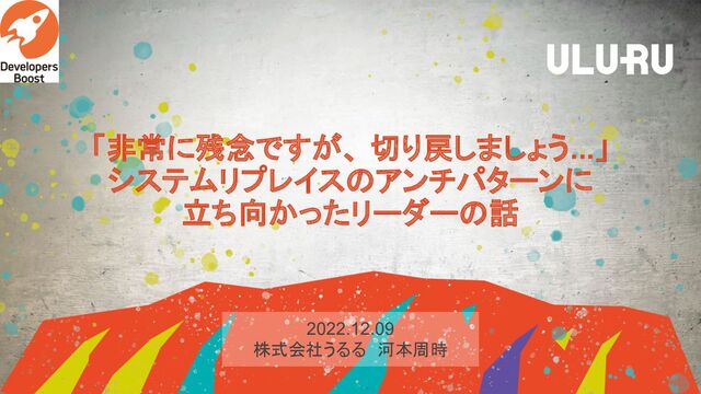2022.12.09 株式会社うるる 河本周時 「非常に残念ですが、 切り戻しましょう...」 システムリプレイスのアンチパターンに 立ち向かったリーダーの話