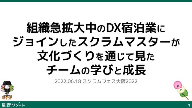 組織急拡大中のDX宿泊業に ジョインしたスクラムマスターが 文化づくりを通じて見た チームの学びと成長 2022.06.18 スクラムフェス大阪2022 1