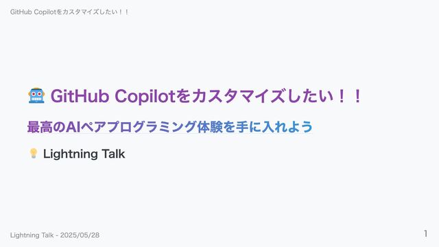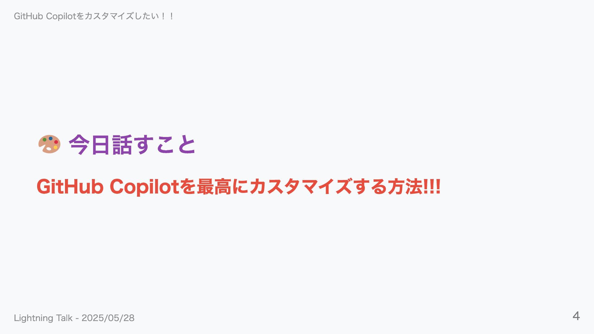 今日話すこと GitHub Copilotを最高にカスタマイズする方法!!! GitHub Copilotをカスタマイズしたい!! Lightning Talk - 2025/05/28 4