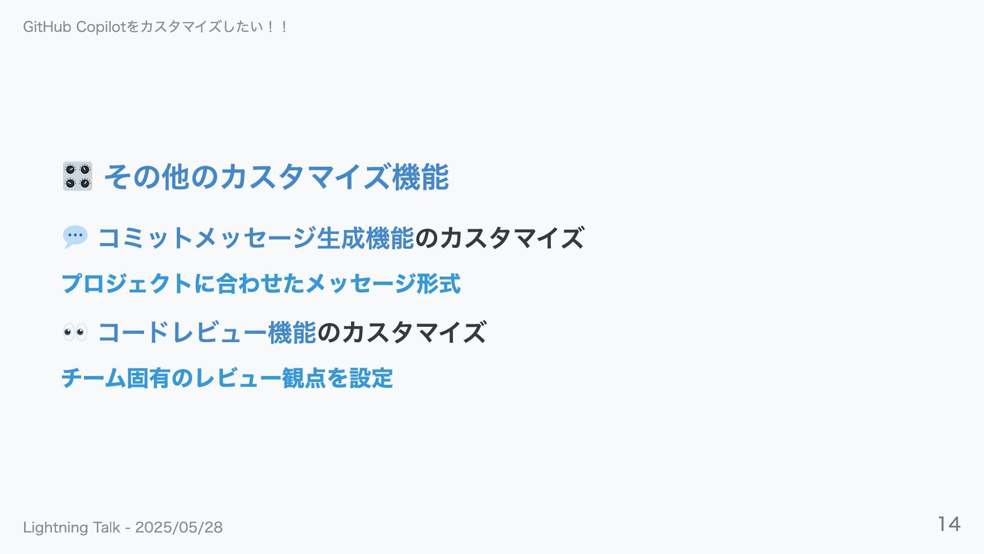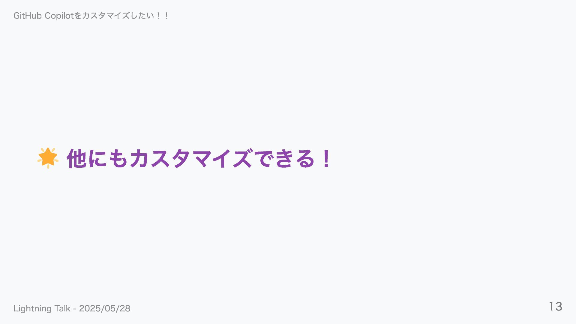 他にもカスタマイズできる! GitHub Copilotをカスタマイズしたい!! Lightning Talk - 2025/05/28 13