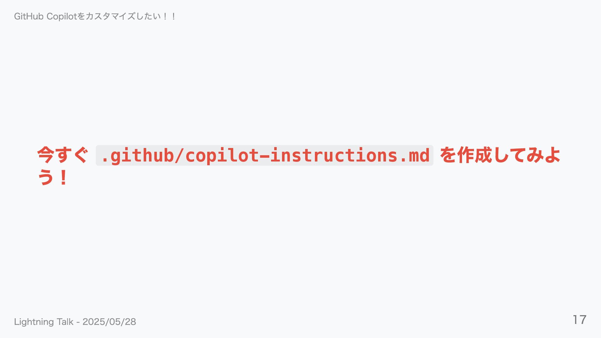 今すぐ .github/copilot-instructions.md を作成してみよ う! GitHub Copilotをカスタマイズしたい!! Lightning Talk - 2025/05/28