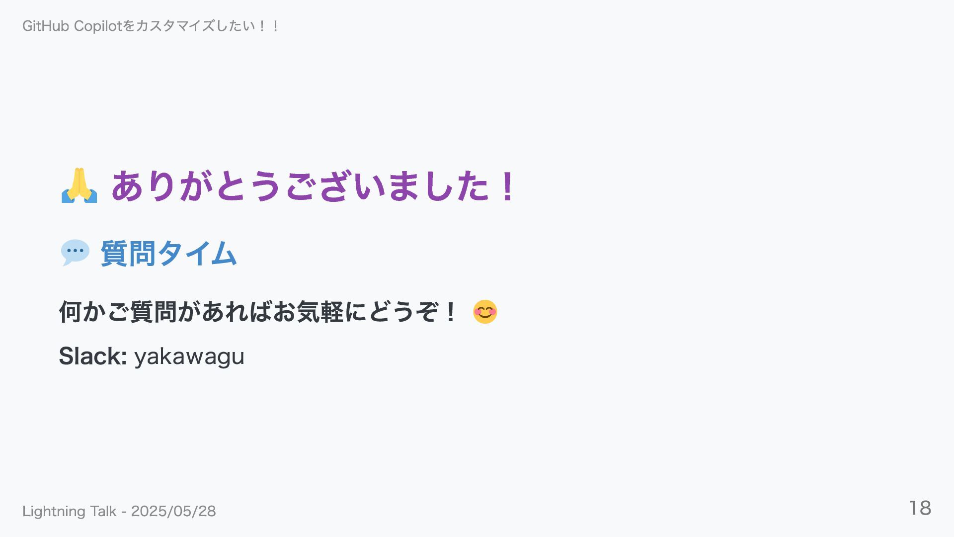 ありがとうございました! 質問タイム 何かご質問があればお気軽にどうぞ! Slack: yakawagu GitHub Copilotをカスタマイズしたい!! Lightning Talk -