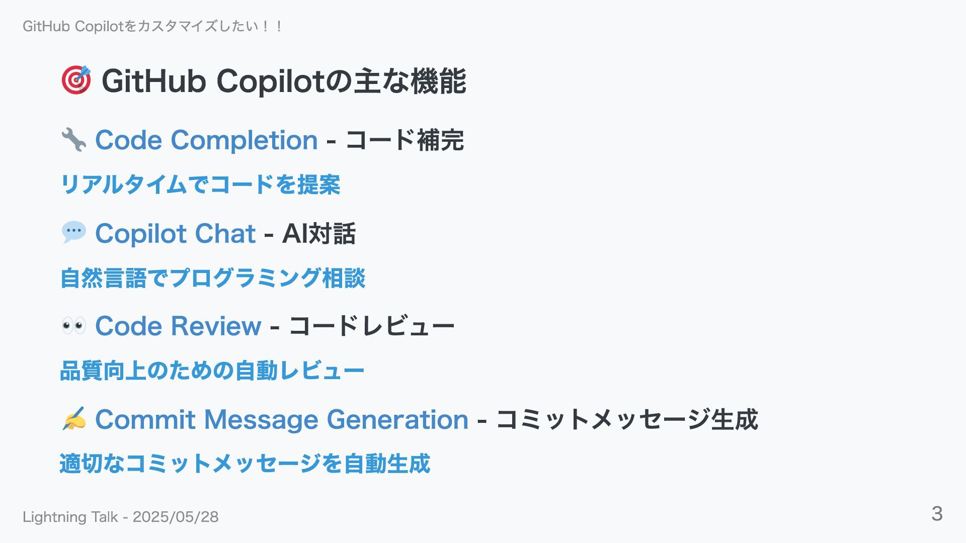 AI対話 自然言語でプログラミング相談 Code Review - コードレビュー 品質向上のための自動レビュー Commit Message Generation - コミットメッセージ生成 適切なコミットメッセージを自動生成 GitHub Copilotをカスタマイズしたい!! Lightning Talk - 2025/05/28 3
