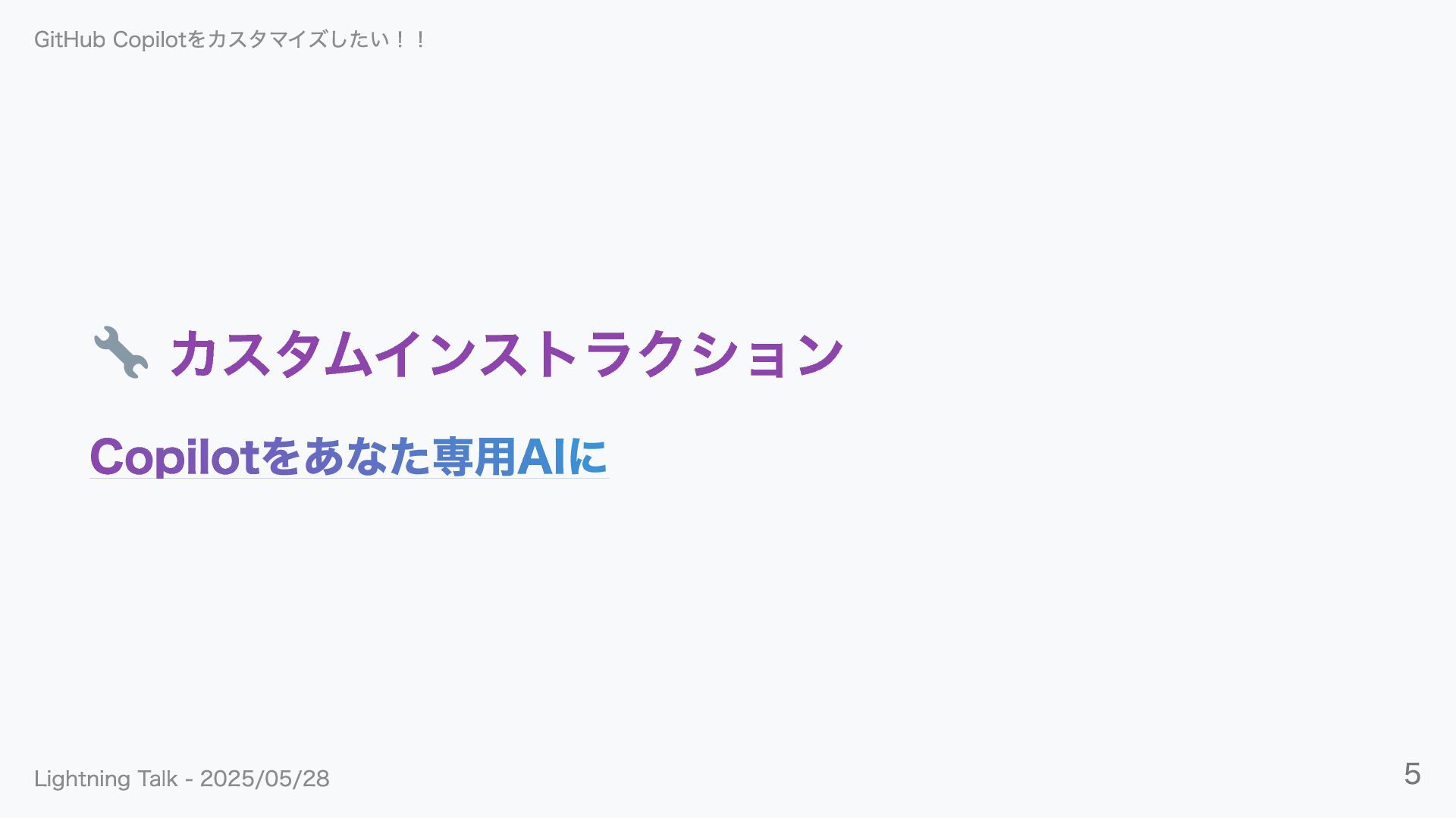 カスタムインストラクション Copilotをあなた専用AIに GitHub Copilotをカスタマイズしたい!! Lightning Talk - 2025/05/28 5