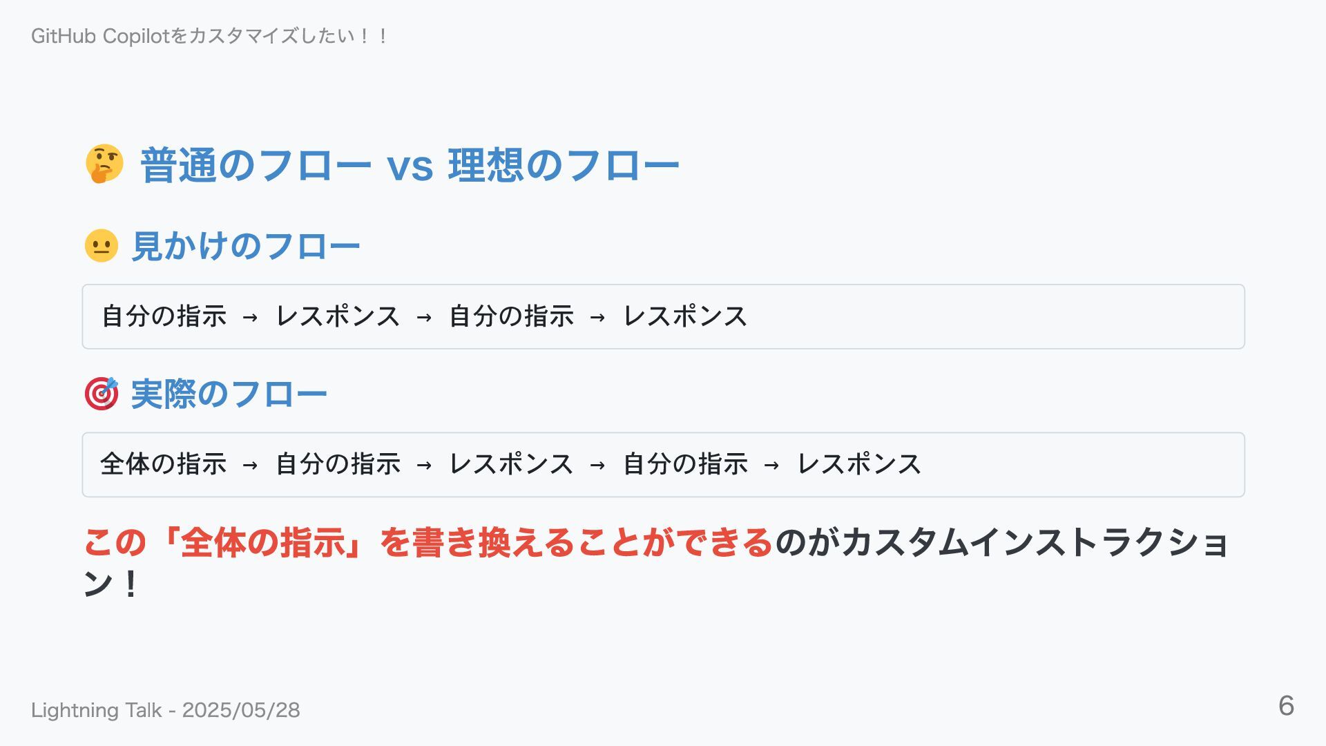 レスポンス 実際のフロー 全体の指示 → 自分の指示 → レスポンス → 自分の指示 → レスポンス この「全体の指示」を書き換えることができるのがカスタムインストラクショ ン! GitHub Copilotをカスタマイズしたい!! Lightning Talk - 2025/05/28 6