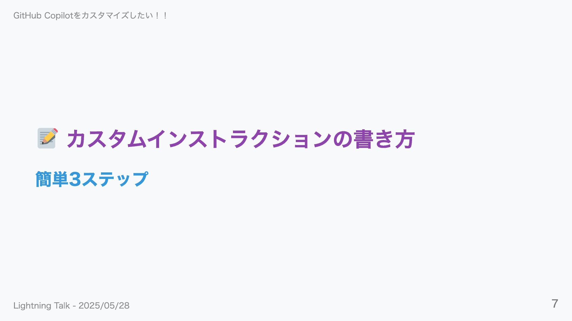 カスタムインストラクションの書き方 簡単3ステップ GitHub Copilotをカスタマイズしたい!! Lightning Talk - 2025/05/28 7