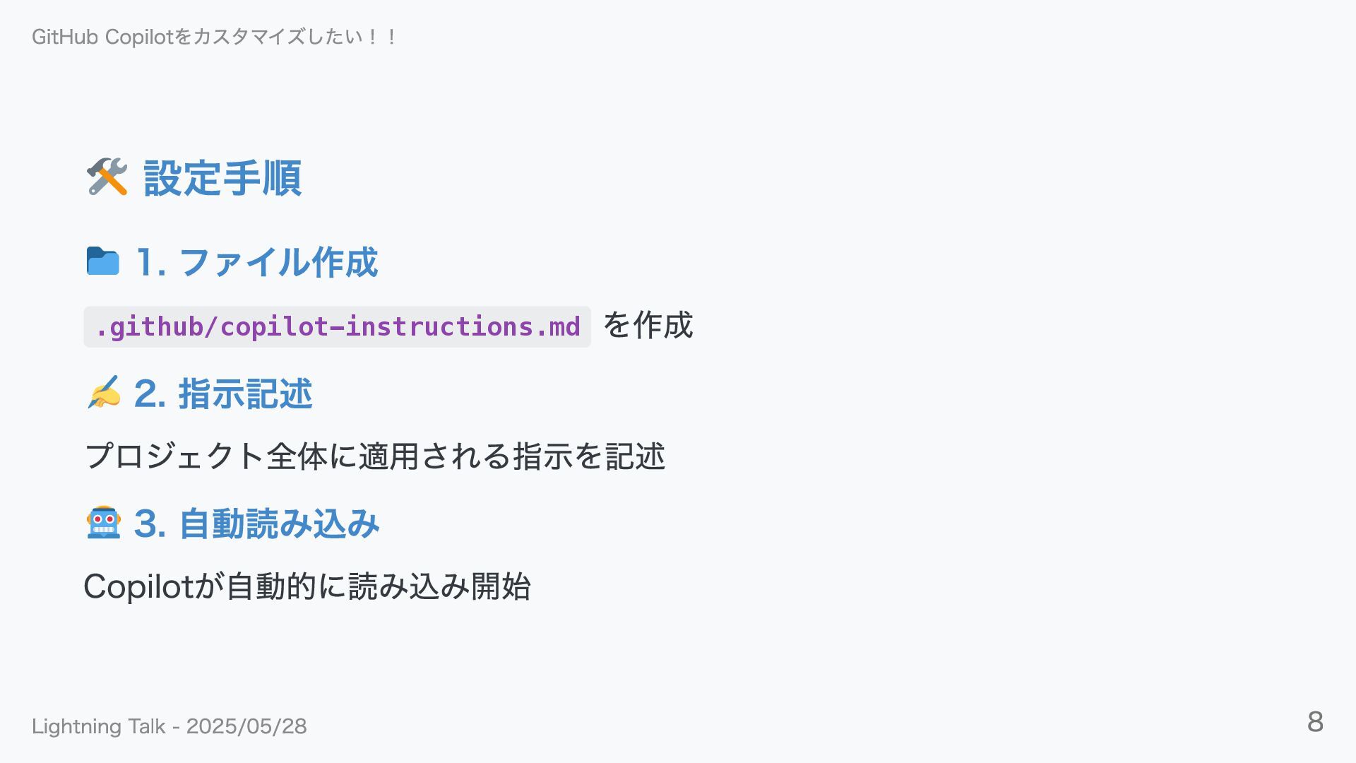 Copilotが自動的に読み込み開始 GitHub Copilotをカスタマイズしたい!! Lightning Talk - 2025/05/28 8