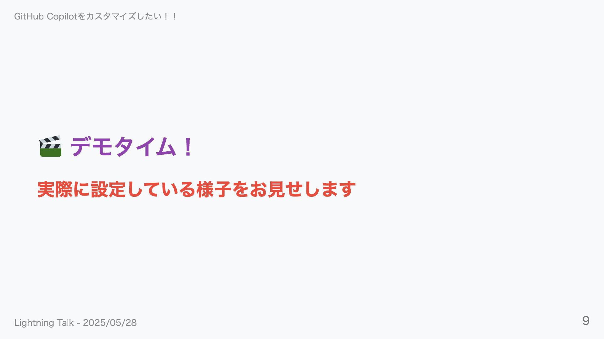 デモタイム! 実際に設定している様子をお見せします GitHub Copilotをカスタマイズしたい!! Lightning Talk - 2025/05/28 9