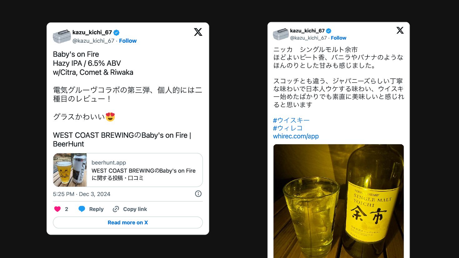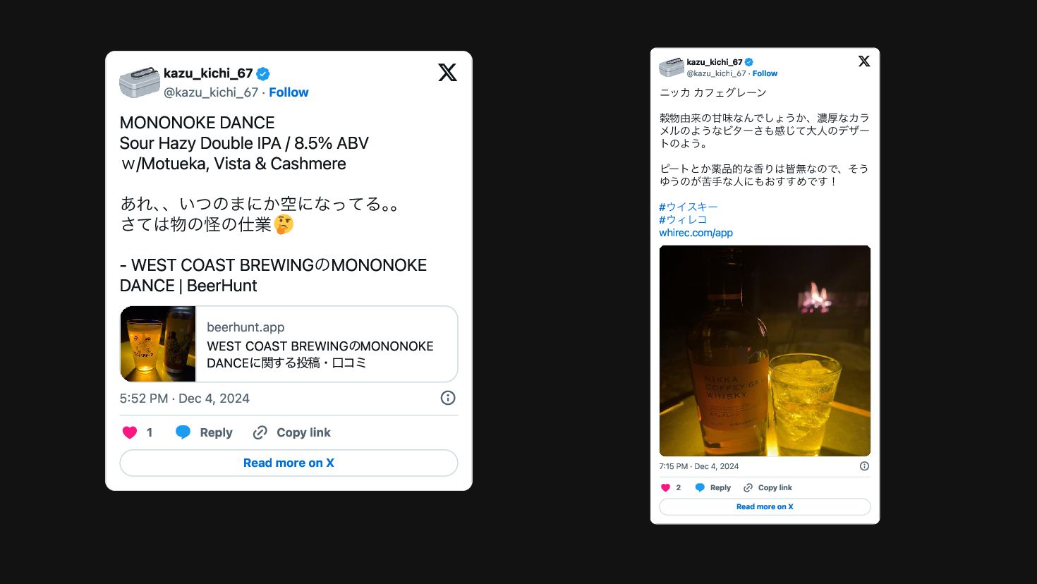 ABV w /Motueka, Vista & Cashmere あれ、 、いつのまにか空になってる。 。 さては物の怪の仕業 - WEST COAST BREWINGの MONONOKE DANCE | BeerHunt beerhunt.app WEST COAST BREWINGの MONONOKE DANCEに関する投稿・口コミ 5:52 PM · Dec 4, 2024 1 Reply Copy link Read more on X kazu_kichi_67 @kazu_kichi_67·Follow ニッカ カフェグレーン 穀物由来の甘味なんでしょうか、濃厚なカラ メルのようなビターさも感じて大人のデザー トのよう。 ピートとか薬品的な香りは皆無なので、そう ゆうのが苦手な人にもおすすめです! #ウイスキー #ウィレコ whirec.com/app 7:15 PM · Dec 4, 2024 2 Reply Copy link Read more on X