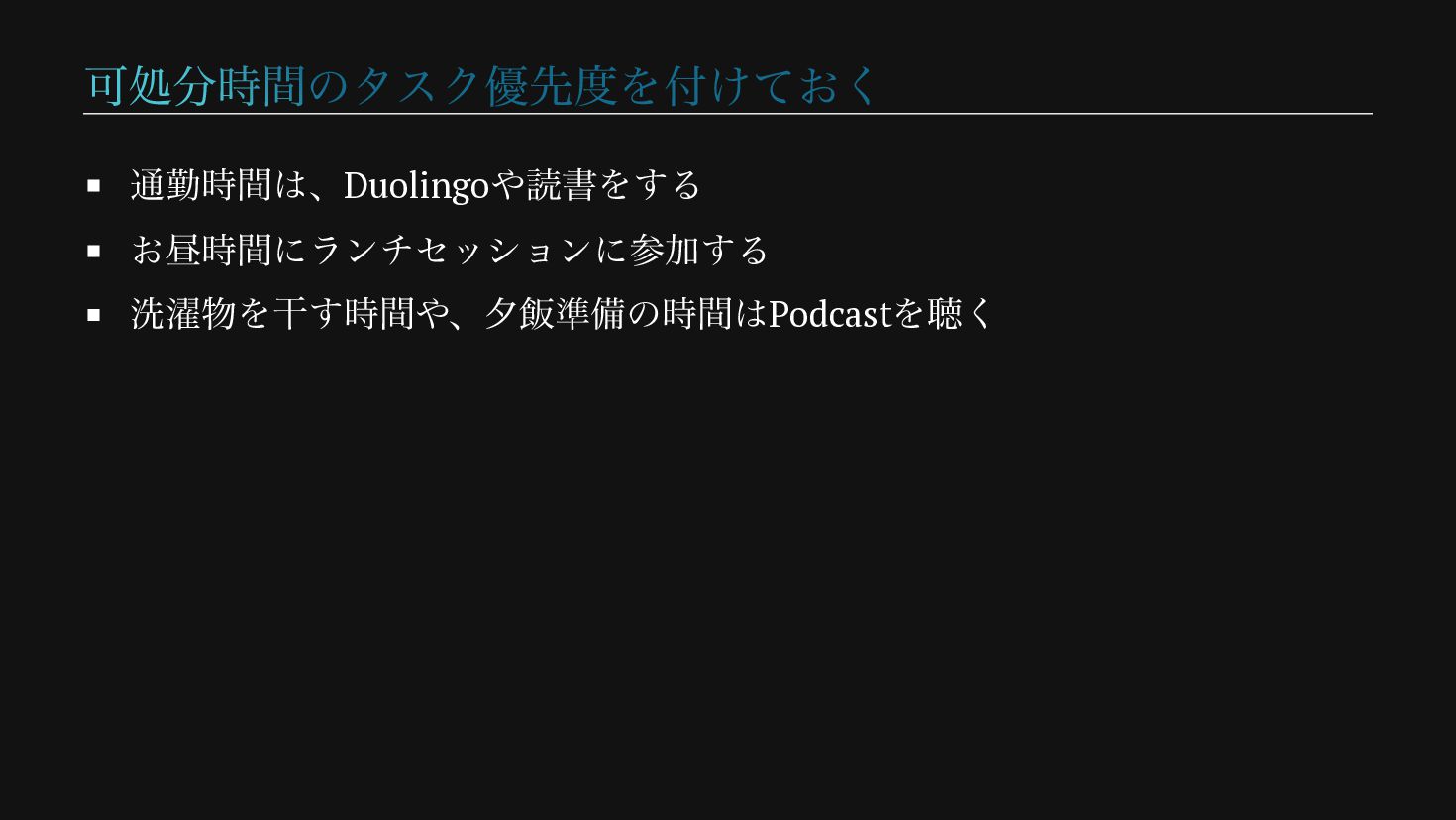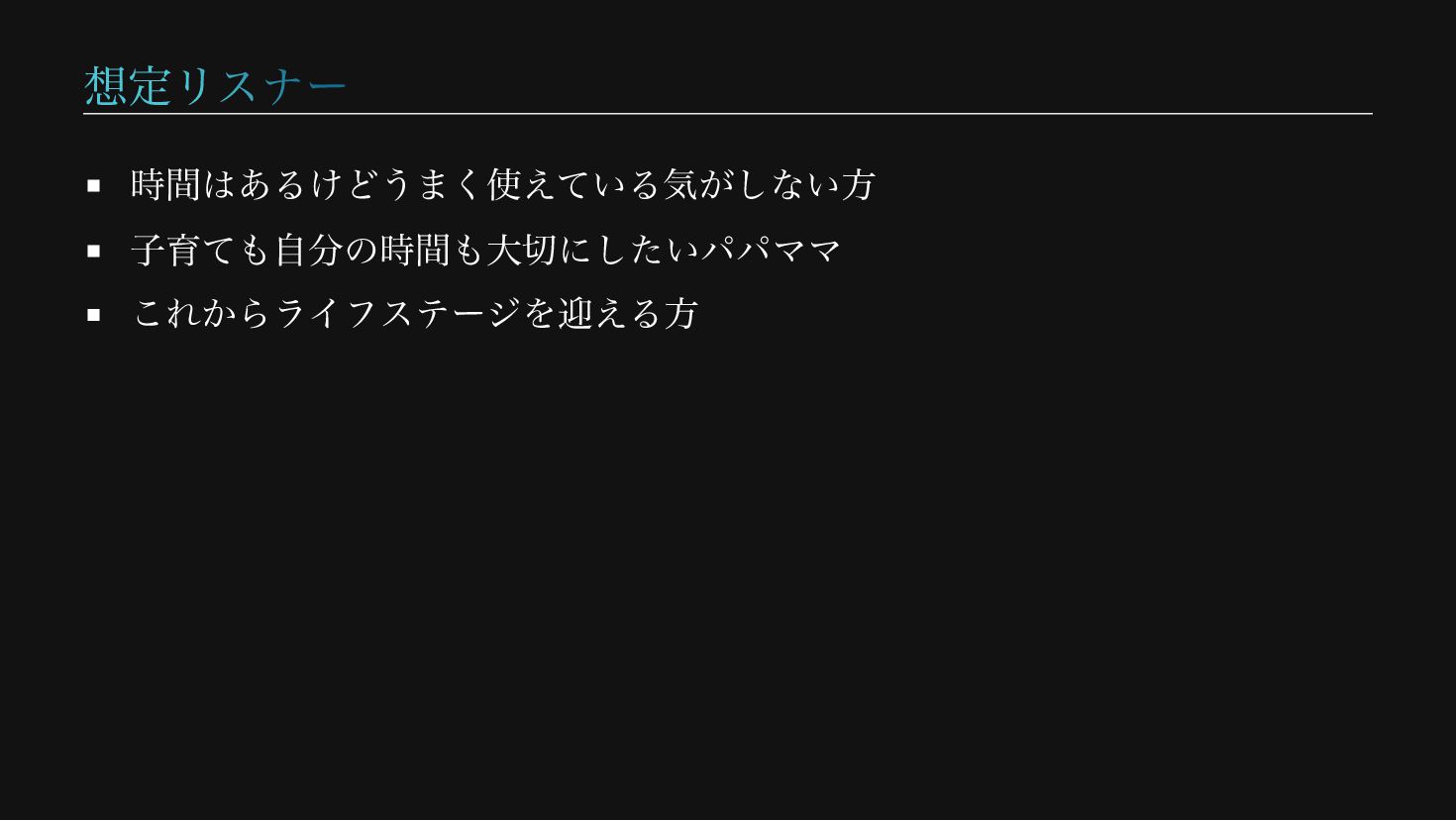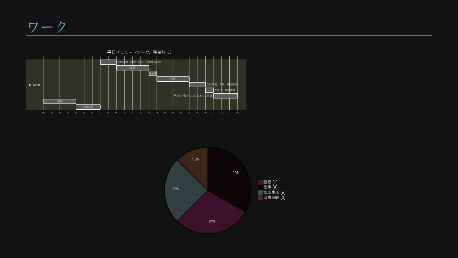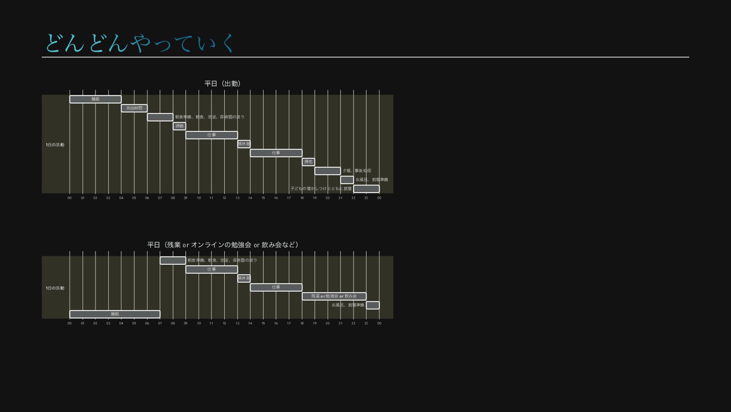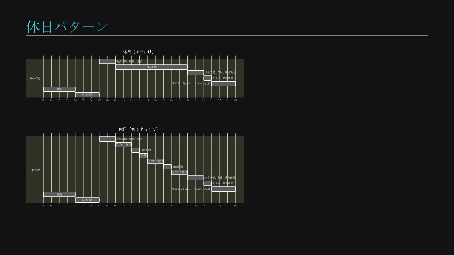 09 10 11 12 13 14 15 16 17 18 19 20 21 22 23 00 睡眠 自由時間 朝食準備、朝食、洗濯 お出かけ 夕食準備、夕飯、事後処理 お風呂、就寝準備 子どもの寝かしつけとともに就寝 1日の活動 休日(お出かけ) 00 01 02 03 04 05 06 07 08 09 10 11 12 13 14 15 16 17 18 19 20 21 22 23 00 睡眠 自由時間 朝食準備、朝食、洗濯 子どもと遊ぶ 自由時間 お昼 子どもと遊ぶ 自由時間 子どもと遊ぶ 夕食準備、夕飯、事後処理 お風呂、就寝準備 子どもの寝かしつけとともに就寝 1日の活動 休日(家でゆっくり)