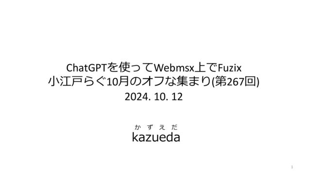 ChatGPTを使ってWebmsx上でFuzix 小江戸らぐ10月のオフな集まり(第267回) 2024. 10. 12 1 kazueda か ず え