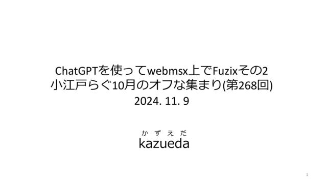 ChatGPTを使ってwebmsx上でFuzixその2 小江戸らぐ10月のオフな集まり(第268回) 2024. 11. 9 1 kazueda か ず え