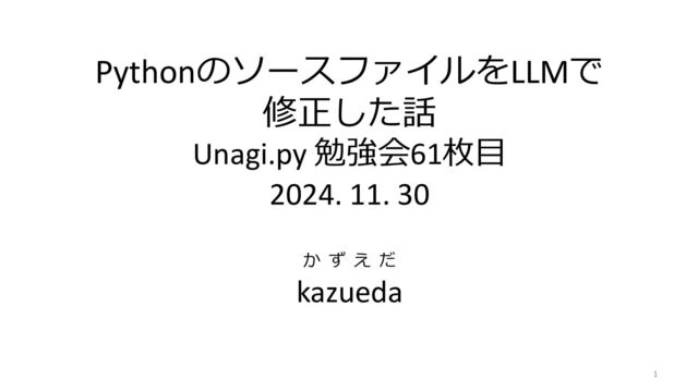 PythonのソースファイルをLLMで 修正した話 Unagi.py 勉強会61枚目 2024. 11. 30 か ず え