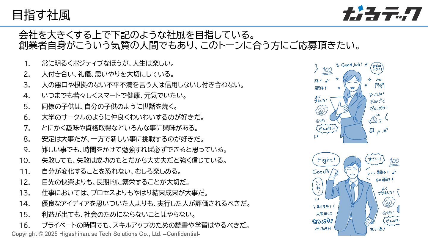 14. Copyright © 2025 Higashinaruse Tech Solutions Co., Ltd. –Confidential- 目指す社風