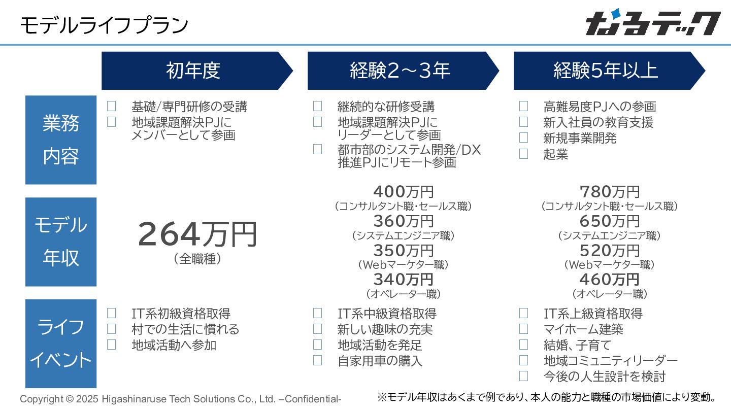 業務 内容 モデル 年収 初年度 経験2~3年 経験5年以上 基礎/専門研修の受講 地域課題解決PJに メンバーとして参画 継続的な研修受講 地域課題解決PJに リーダーとして参画 都市部のシステム開発/DX 推進PJにリモート参画 高難易度PJへの参画 新入社員の教育支援 新規事業開発 起業 264万円 (全職種) 400万円 (コンサルタント職・セールス職) 360万円 (システムエンジニア職) 350万円 (Webマーケター職) 340万円 (オペレーター職) ライフ イベント IT系初級資格取得 村での生活に慣れる 地域活動へ参加 IT系中級資格取得 新しい趣味の充実 地域活動を発足 自家用車の購入 IT系上級資格取得 マイホーム建築 結婚、子育て 地域コミュニティリーダー 今後の人生設計を検討 ※モデル年収はあくまで例であり、本人の能力と職種の市場価値により変動。 780万円 (コンサルタント職・セールス職) 650万円 (システムエンジニア職) 520万円 (Webマーケター職) 460万円 (オペレーター職)