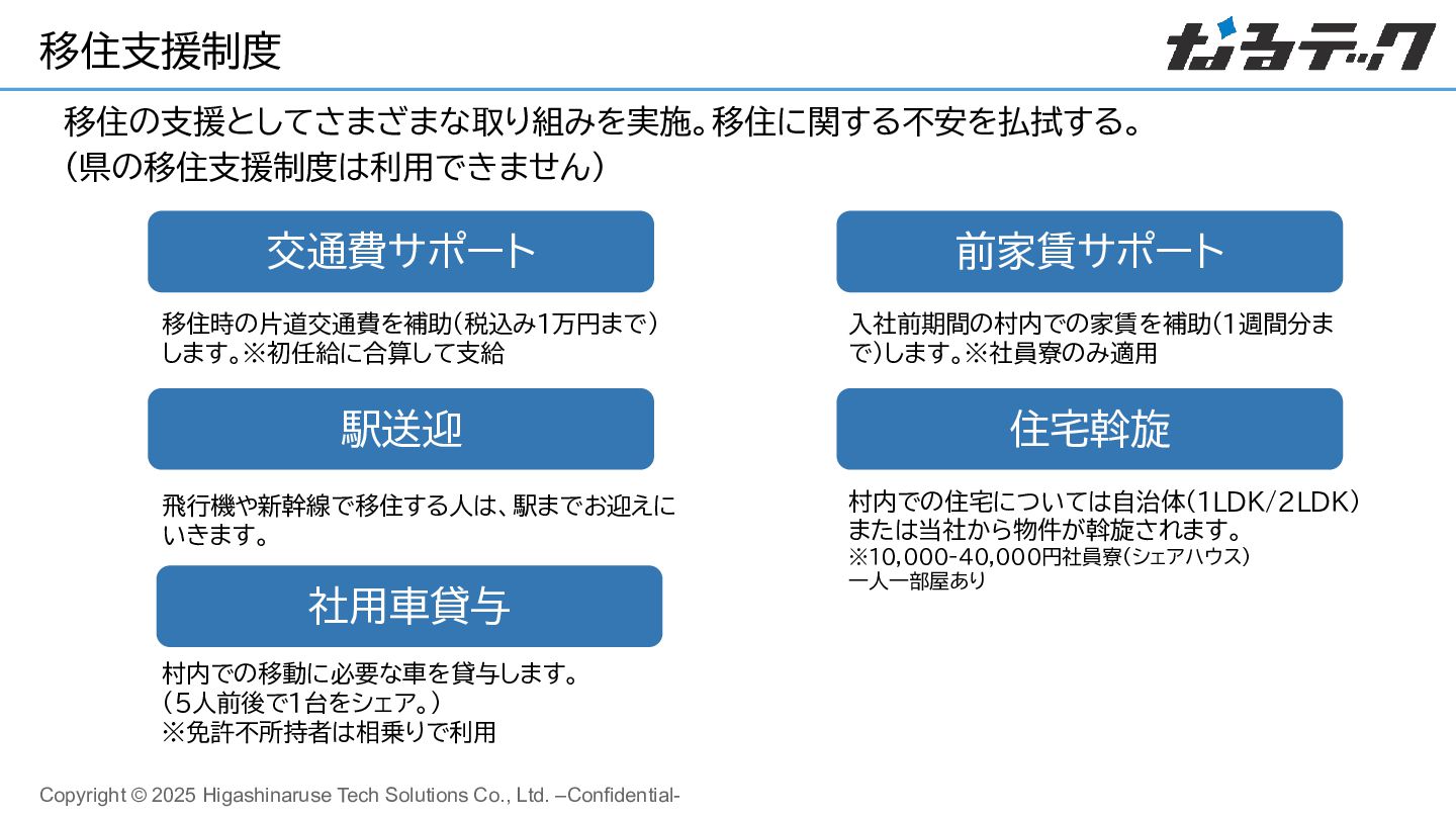 移住の支援としてさまざまな取り組みを実施。移住に関する不安を払拭する。 (県の移住支援制度は利用できません) 交通費サポート 前家賃サポート 移住時の片道交通費を補助(税込み1万円まで)  します。※初任給に合算して支給 入社前期間の村内での家賃を補助(1週間分ま で)します。※社員寮のみ適用 駅送迎 飛行機や新幹線で移住する人は、駅までお迎えに いきます。 社用車貸与 村内での移動に必要な車を貸与します。      (5人前後で1台をシェア。) ※免許不所持者は相乗りで利用 住宅斡旋 村内での住宅については自治体(1LDK/2LDK) または当社から物件が斡旋されます。 ※10,000-40,000円社員寮(シェアハウス)  一人一部屋あり