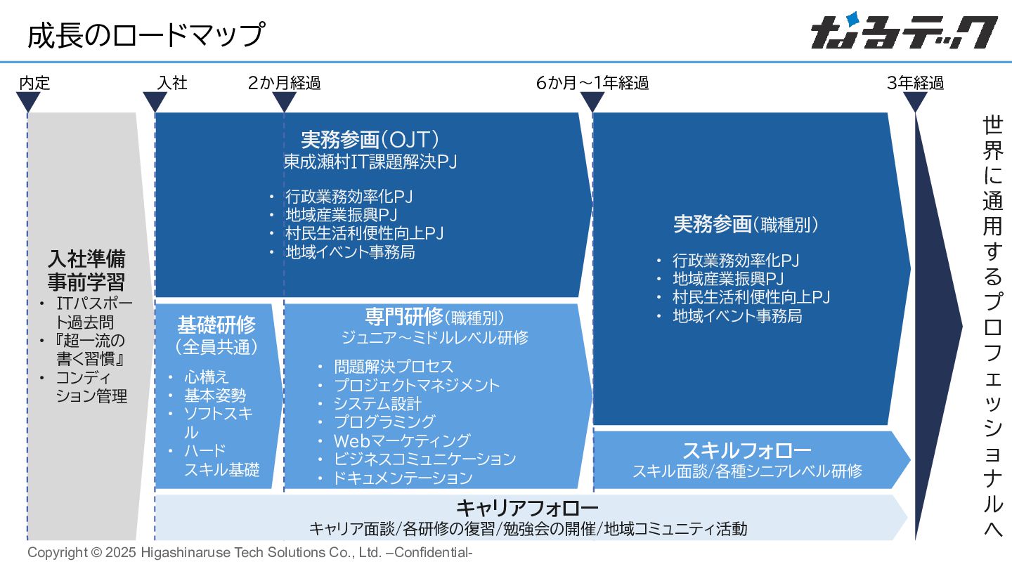 実務参画(OJT) 東成瀬村IT課題解決PJ • 行政業務効率化PJ • 地域産業振興PJ • 村民生活利便性向上PJ • 地域イベント事務局 専門研修(職種別) ジュニア~ミドルレベル研修 • 問題解決プロセス • プロジェクトマネジメント • システム設計 • プログラミング • Webマーケティング • ビジネスコミュニケーション • ドキュメンテーション 入社準備 事前学習 • ITパスポー ト過去問 • 『超一流の 書く習慣』 • コンディ ション管理 基礎研修 (全員共通) • 心構え • 基本姿勢 • ソフトスキ ル • ハード スキル基礎 実務参画(職種別) • 行政業務効率化PJ • 地域産業振興PJ • 村民生活利便性向上PJ • 地域イベント事務局 世 界 に 通 用 す る プ ロ フ ェ ッ シ ョ ナ ル へ スキルフォロー スキル面談/各種シニアレベル研修 入社 2か月経過 6か月~1年経過 内定 キャリアフォロー キャリア面談/各研修の復習/勉強会の開催/地域コミュニティ活動 3年経過
