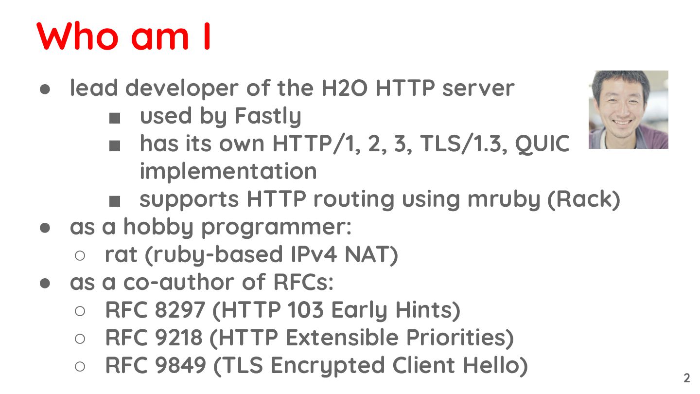 by Fastly ▪ has its own HTTP/1, 2, 3, TLS/1.3, QUIC implementation ▪ supports HTTP routing using mruby (Rack) • as a hobby programmer: ◦ rat (ruby-based IPv4 NAT) • as a co-author of RFCs: ◦ RFC 8297 (HTTP 103 Early Hints) ◦ RFC 9218 (HTTP Extensible Priorities) ◦ RFC 9849 (TLS Encrypted Client Hello) Who am I 2