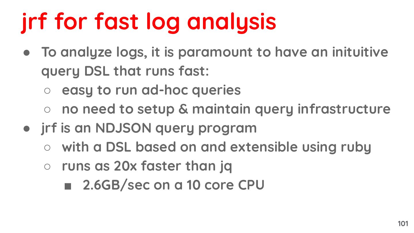 inituitive query DSL that runs fast: ◦ easy to run ad-hoc queries ◦ no need to setup & maintain query infrastructure • jrf is an NDJSON query program ◦ with a DSL based on and extensible using ruby ◦ runs as 20x faster than jq ▪ 2.6GB/sec on a 10 core CPU jrf for fast log analysis 101