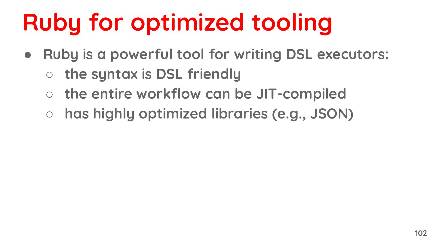 ◦ the syntax is DSL friendly ◦ the entire workflow can be JIT-compiled ◦ has highly optimized libraries (e.g., JSON) Ruby for optimized tooling 102