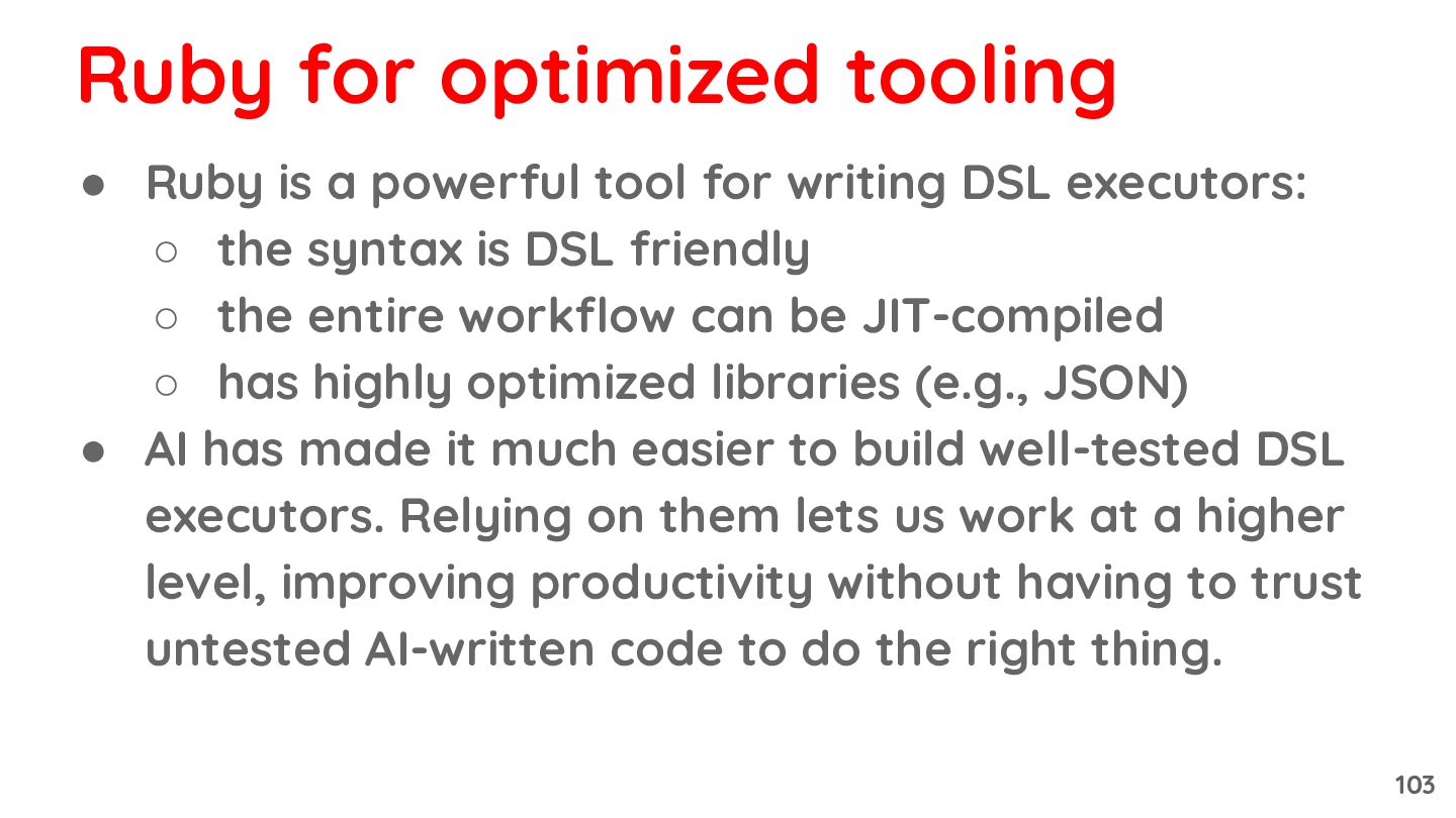 ◦ the syntax is DSL friendly ◦ the entire workflow can be JIT-compiled ◦ has highly optimized libraries (e.g., JSON) • AI has made it much easier to build well-tested DSL executors. Relying on them lets us work at a higher level, improving productivity without having to trust untested AI-written code to do the right thing. Ruby for optimized tooling 103