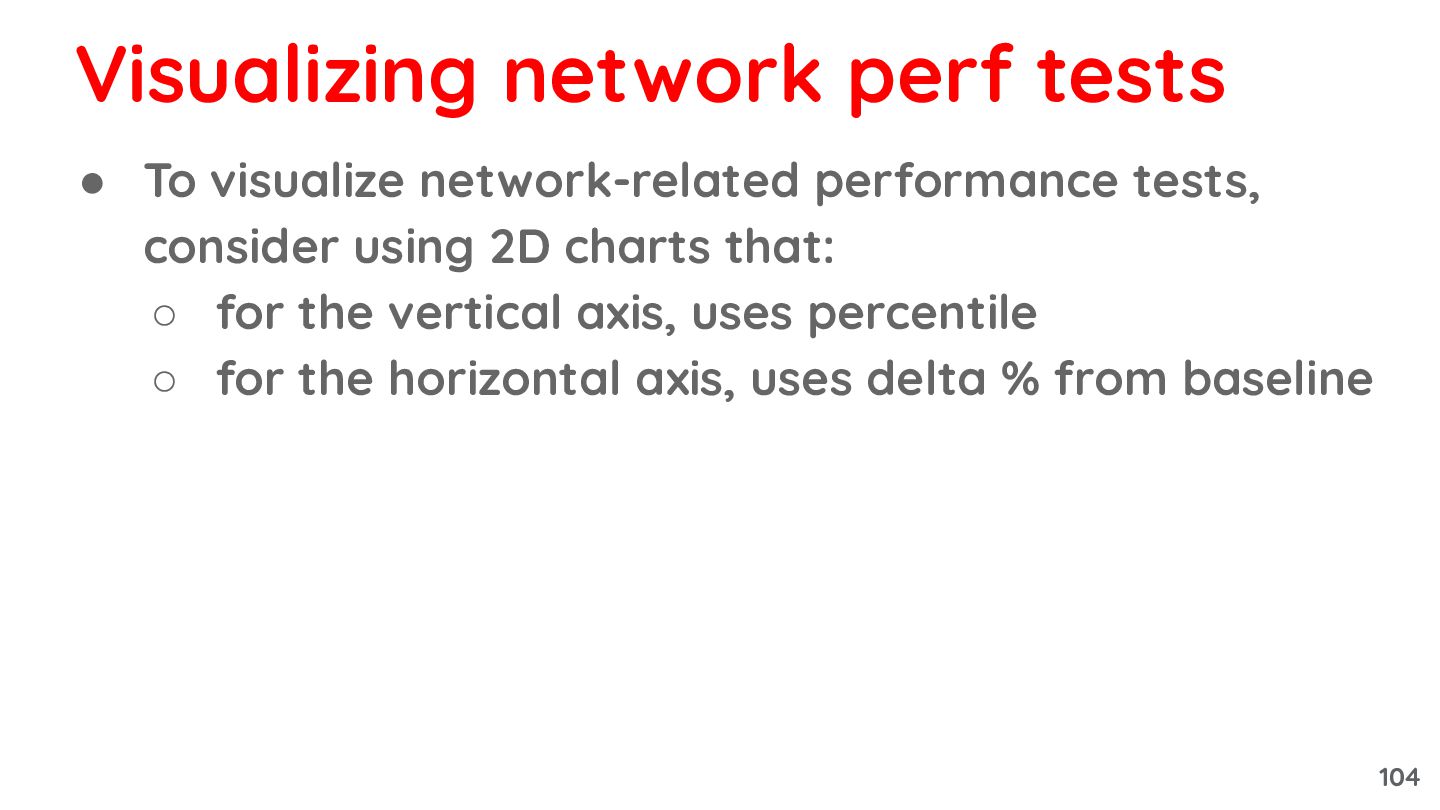 that: ◦ for the vertical axis, uses percentile ◦ for the horizontal axis, uses delta % from baseline Visualizing network perf tests 104