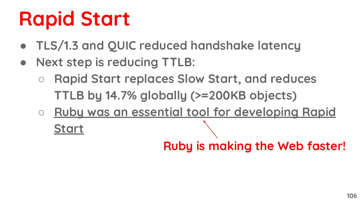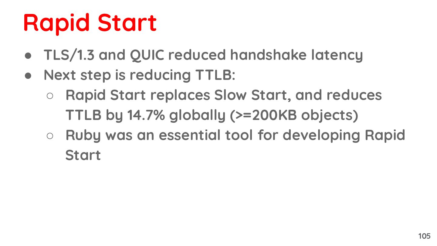 is reducing TTLB: ◦ Rapid Start replaces Slow Start, and reduces TTLB by 14.7% globally (>=200KB objects) ◦ Ruby was an essential tool for developing Rapid Start Rapid Start 105