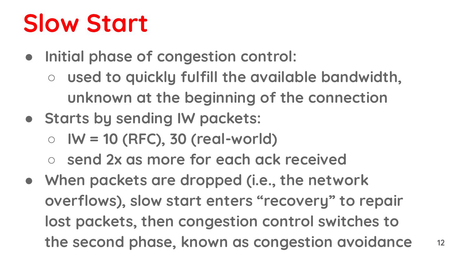 available bandwidth is unknown ◦ to quicly determine the available bandwidth • Start by sending IW packets: ◦ IW = 10 (RFC), 30 (real-world) ◦ send 2x as more for each ack received Slow Start 11