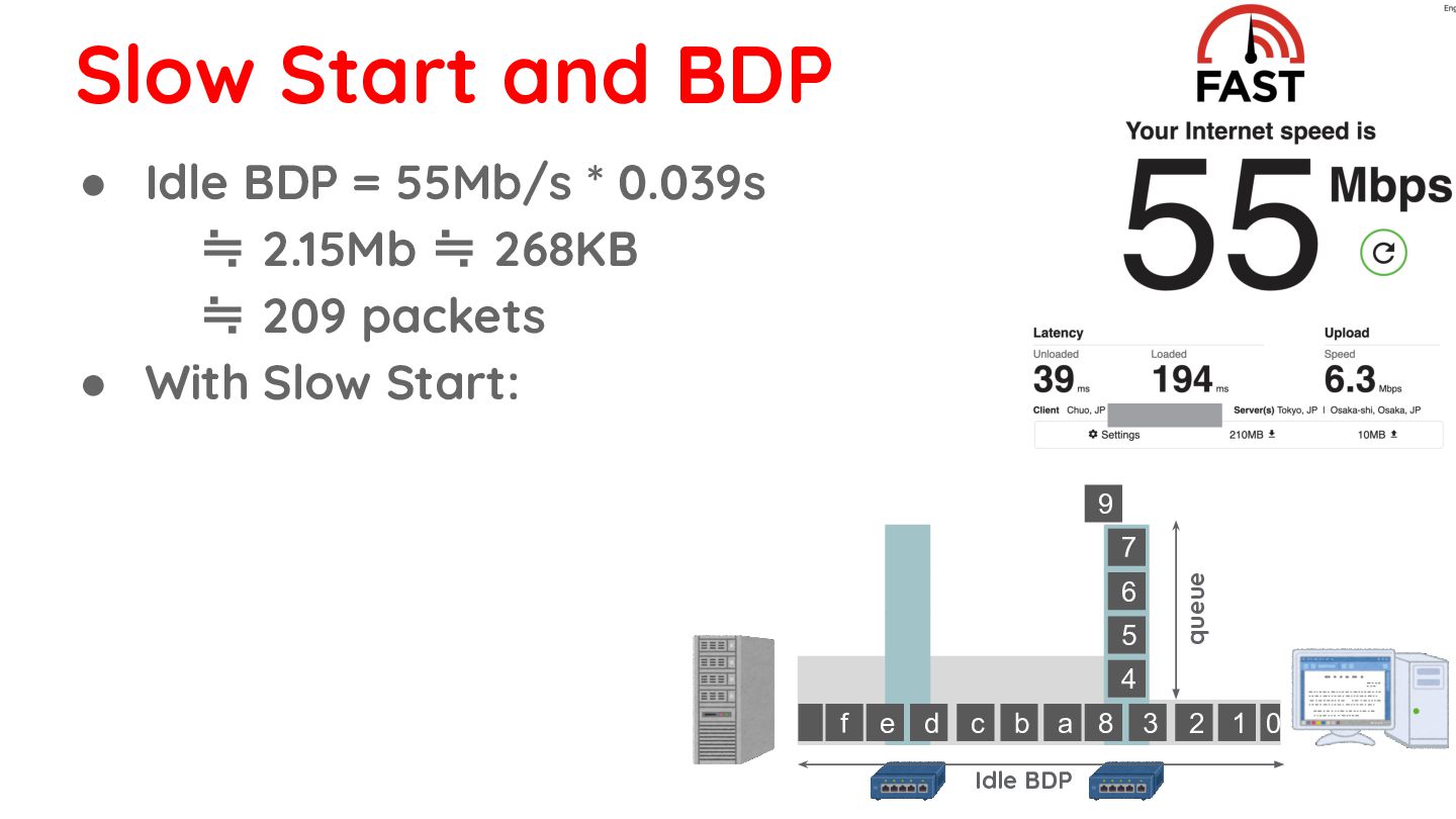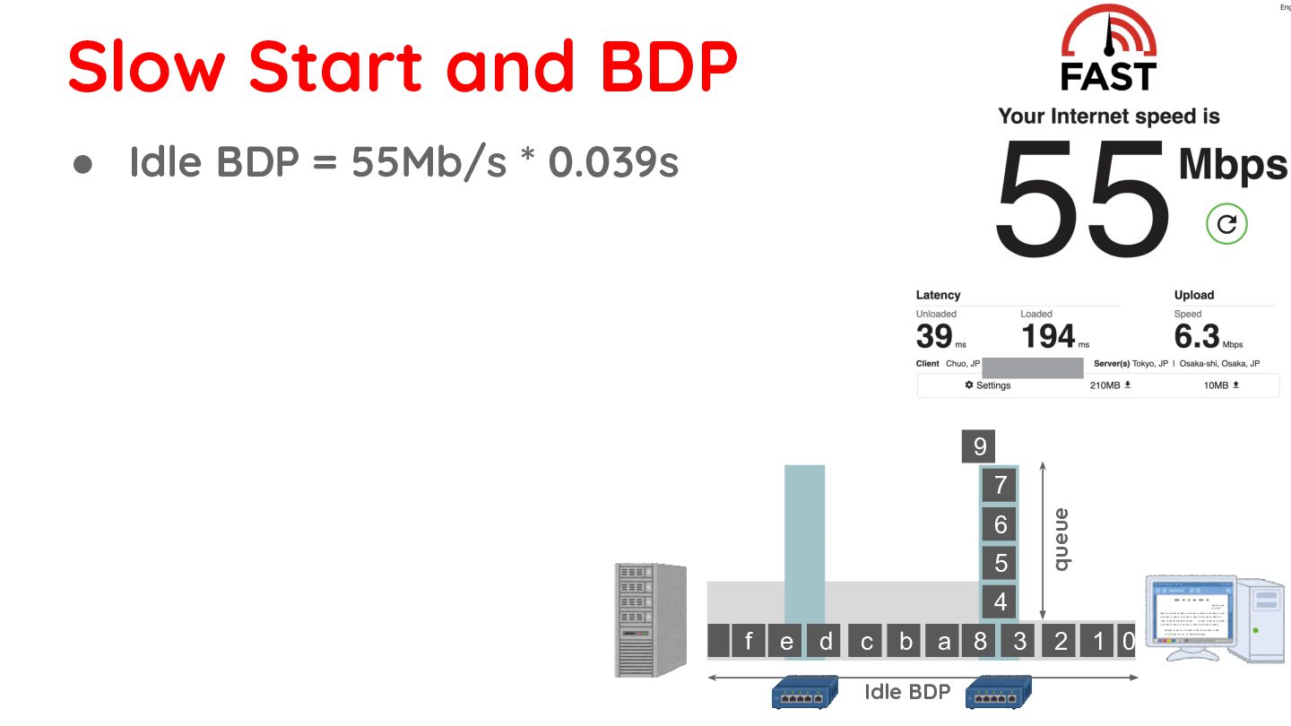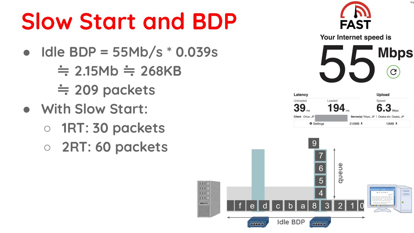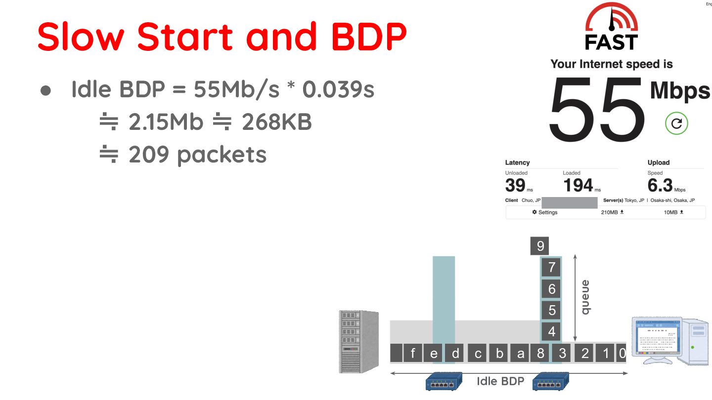 268KB ≒ 209 packets • With Slow Start: ◦ 1RT: 30 packets ◦ 2RT: 60 packets ◦ 3RT: 120 packets ◦ 4RT: 240 packets 0 1 2 3 8 d c b a f e 4 5 6 7 9 Idle BDP queue bottleneck link is finally saturated Slow Start and BDP