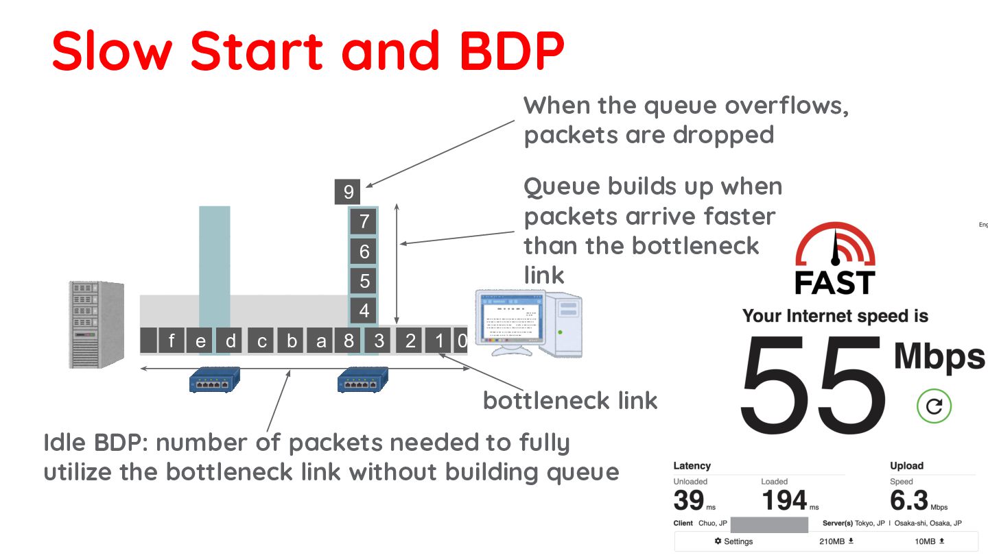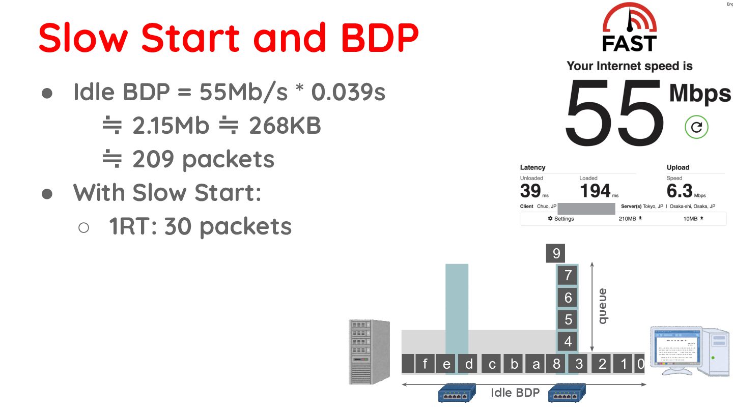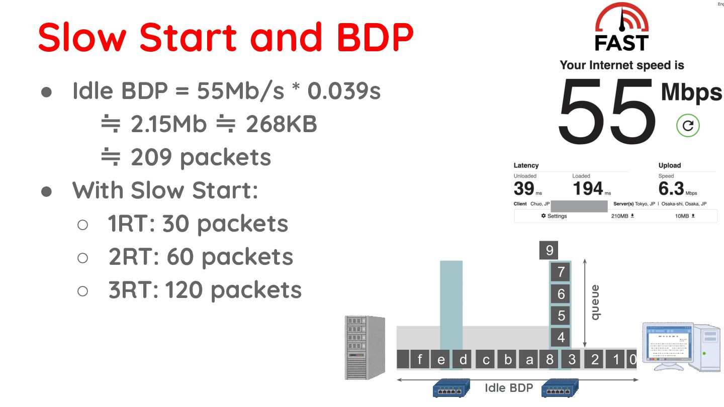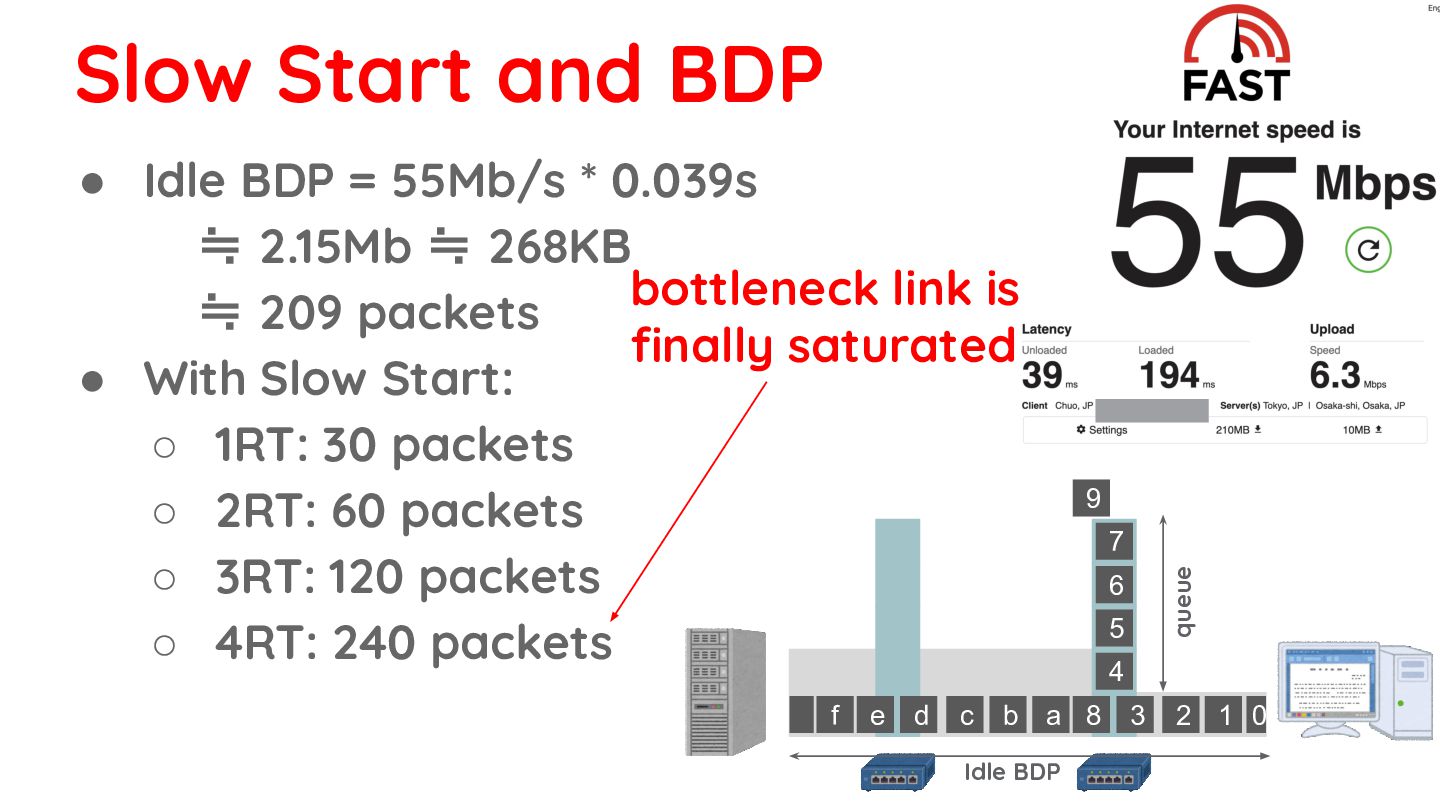 268KB ≒ 209 packets • With Slow Start: ◦ 1RT: 30 packets ◦ 2RT: 60 packets ◦ 3RT: 120 packets ◦ 4RT: 240 packets 0 1 2 3 8 d c b a f e 4 5 6 7 9 Idle BDP queue bottleneck link is finally saturated Slow Start and BDP