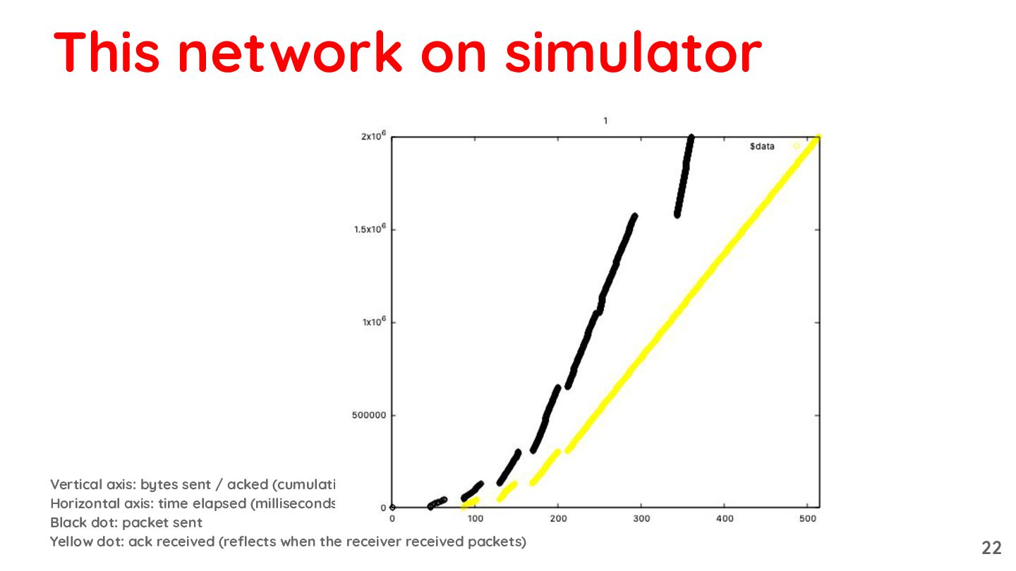 elapsed (milliseconds) Black dot: packet sent Yellow dot: ack received (reflects when the receiver received packets) This network on simulator 22