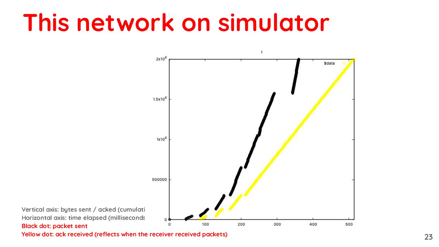 elapsed (milliseconds) Black dot: packet sent Yellow dot: ack received (reflects when the receiver received packets) This network on simulator 23