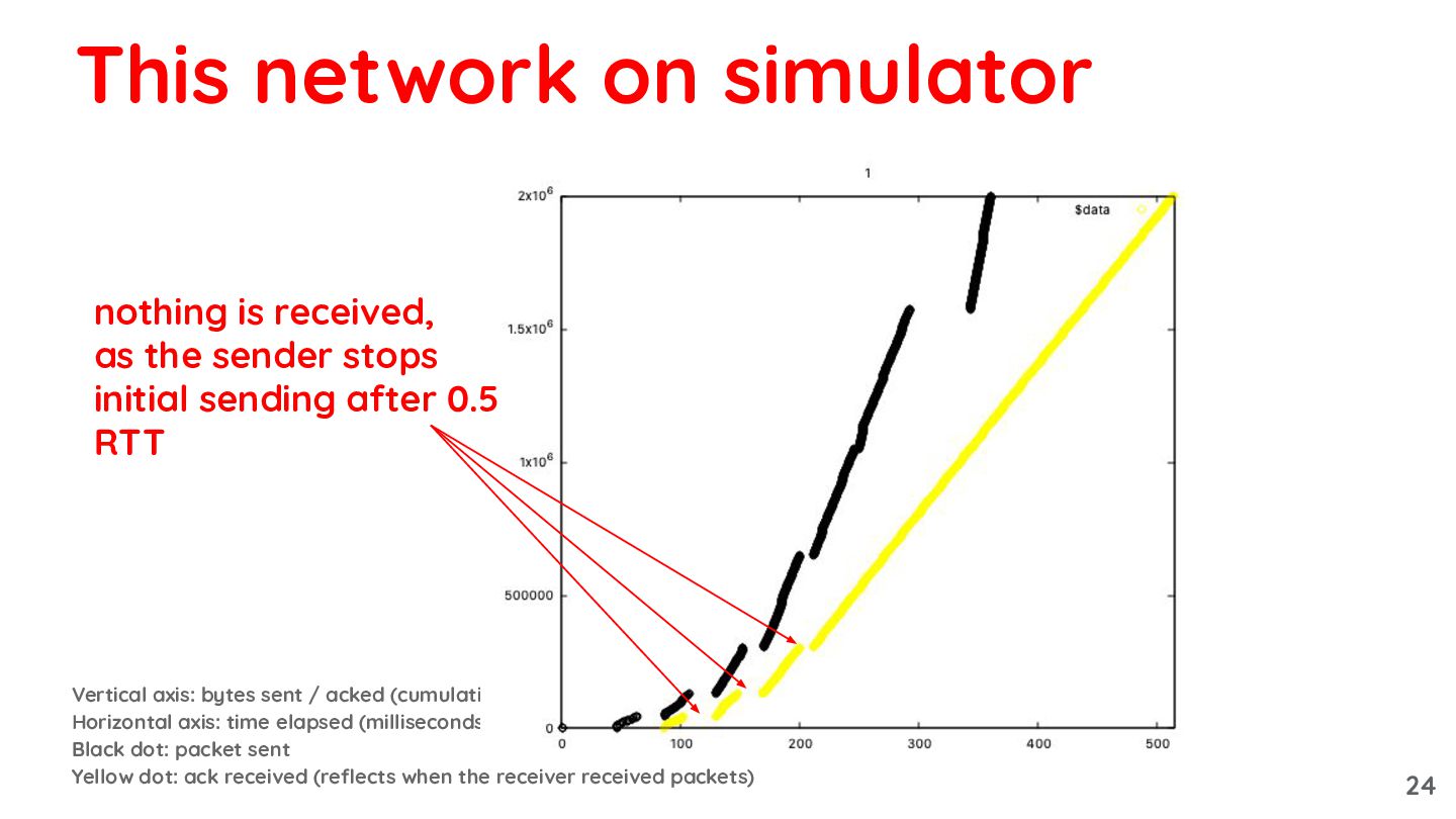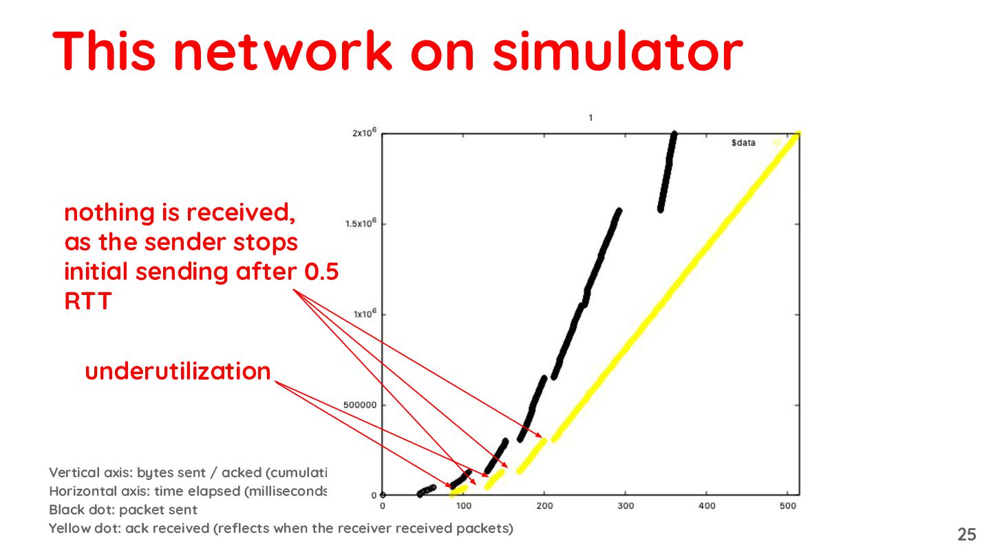 elapsed (milliseconds) Black dot: packet sent Yellow dot: ack received (reflects when the receiver received packets) This network on simulator nothing is received, as the sender stops initial sending after 0.5 RTT 24