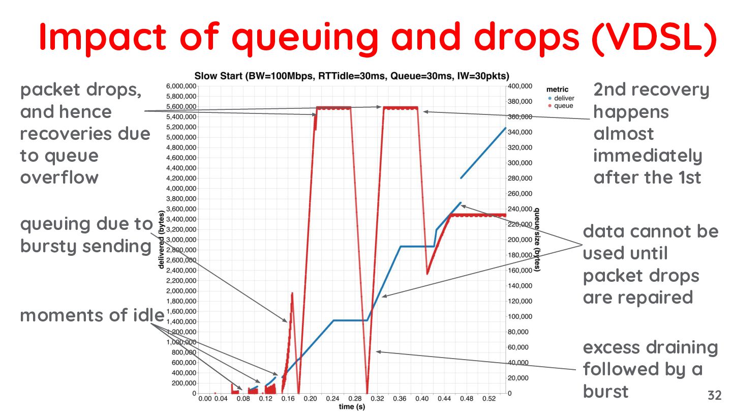 until packet drops are repaired moments of idle queuing due to bursty sending packet drops, and hence recoveries due to queue overflow 2nd recovery happens almost immediately after the 1st 31